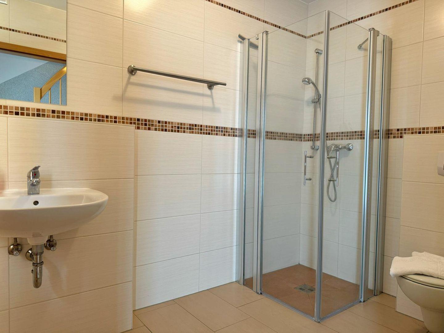 Das Bad bietet eine ebenerdige Dusche.