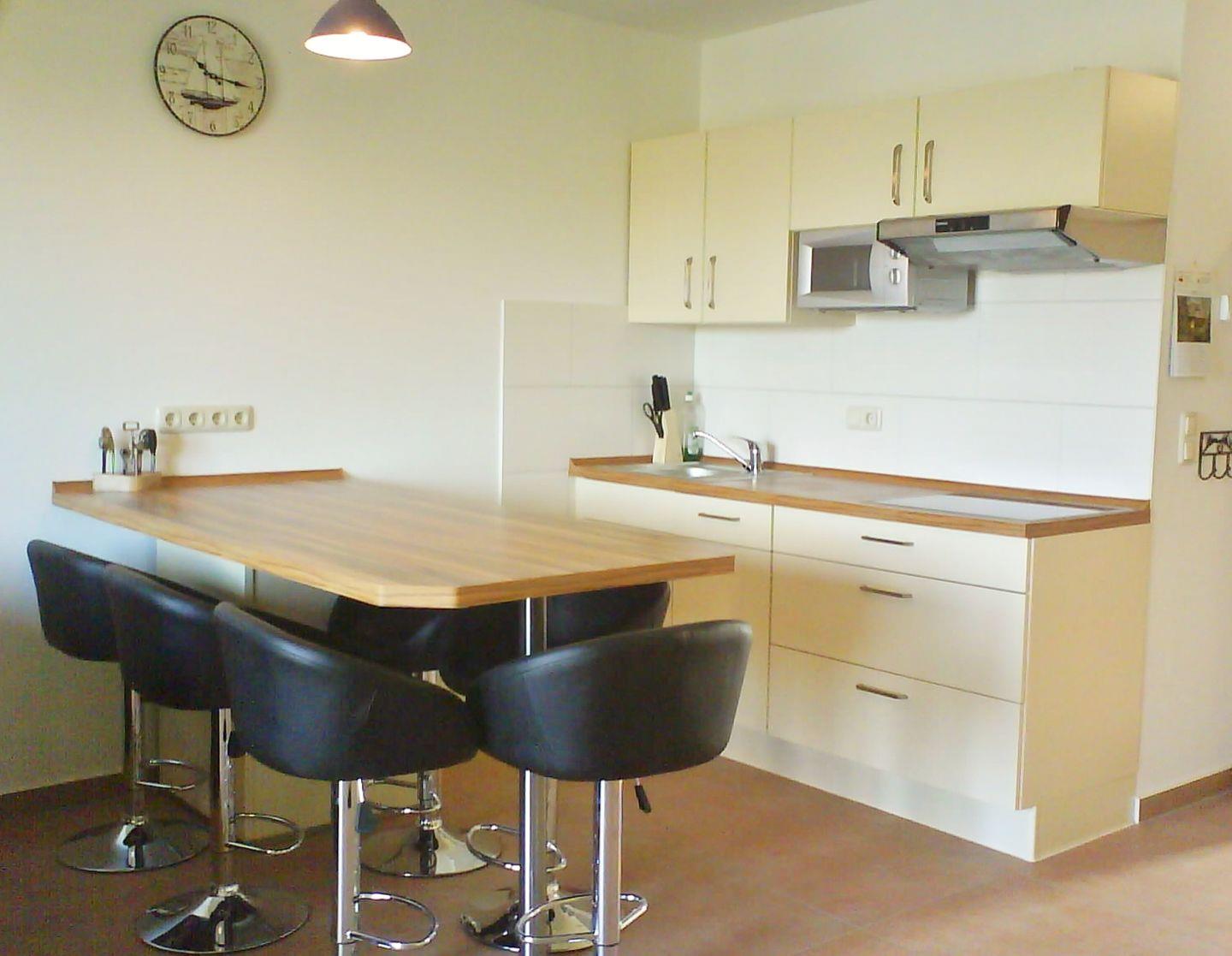 Die 3-Zimmer-Wohnung für 6 Personen erstreckt sich über zwei Etagen mit Wohnbereich, offener Küche und Bad im Erdgeschoß sowie den beiden Schlafräumen im 1. OG.