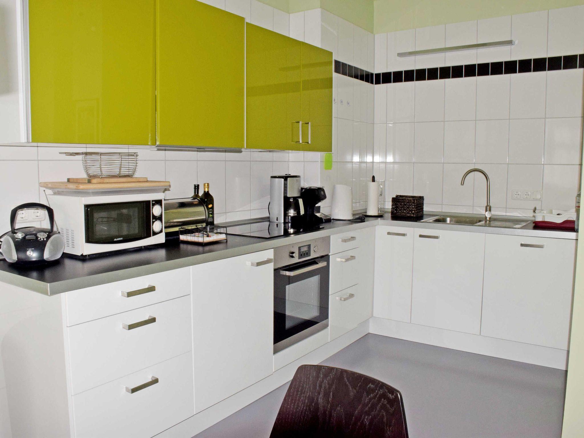 Die moderne Küchenzeile ist exklusiv ausgestattet mit Cerankochfeld, Abzugshaube, Backofen, Mikrowelle, Geschirrspülmaschine, Wasserkocher, Kaffeemaschine, Toaster und umfangreichen weiteren Küchenutensilien.