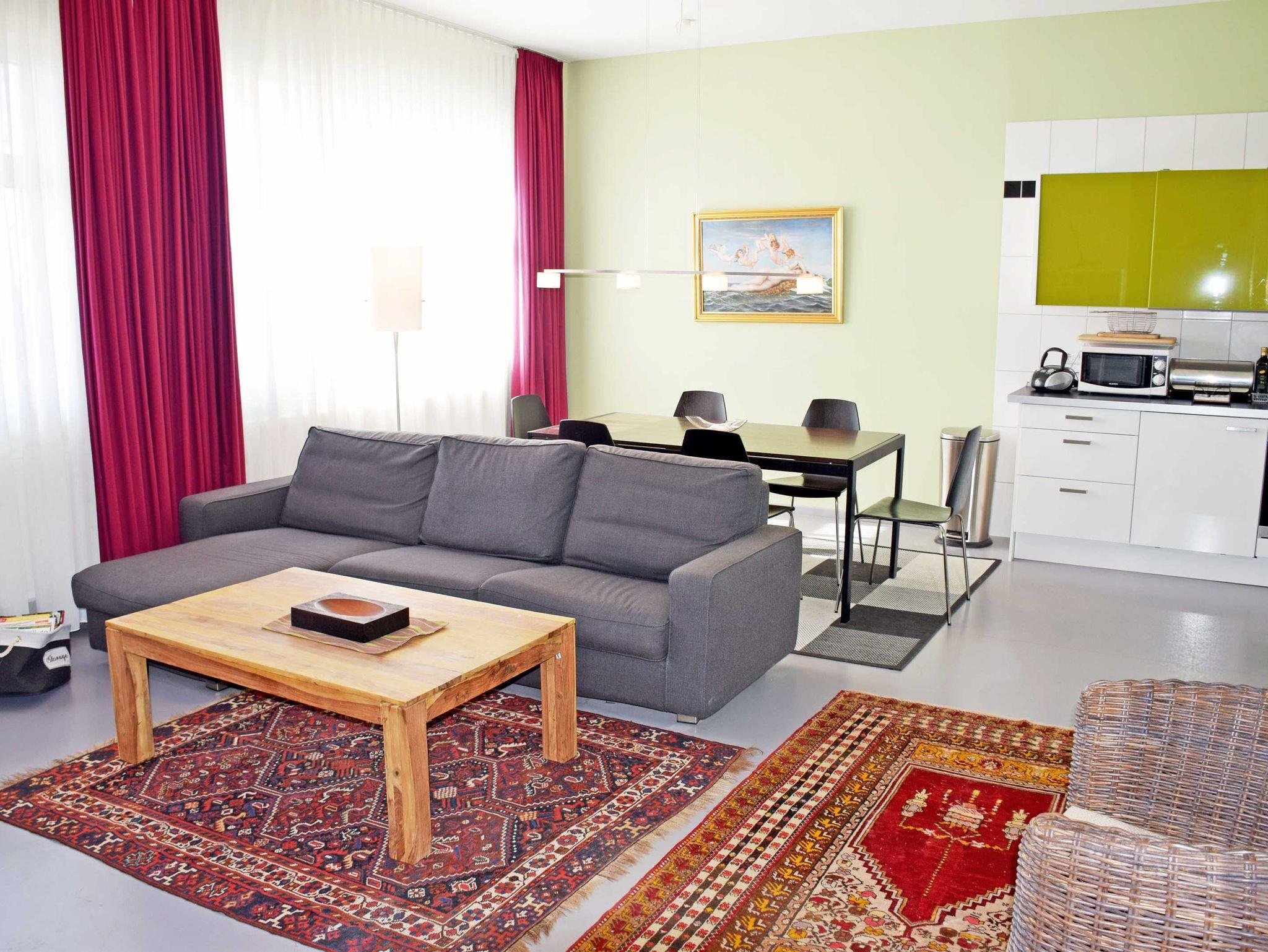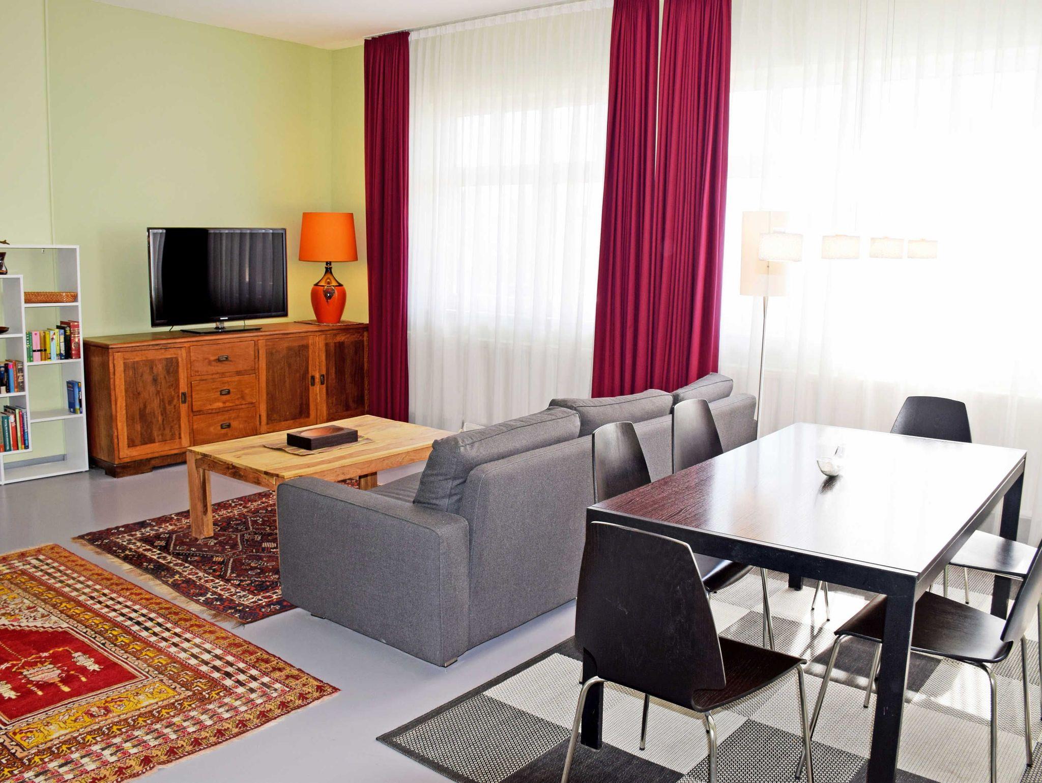 Im Wohnraum befinden sich eine bequeme Schlafcouch für einen Gast, Sessel und ein Tisch, ein modernes Flachbild-TV-Gerät. Hier steht auch ein großer Esstisch mit Stühlen.