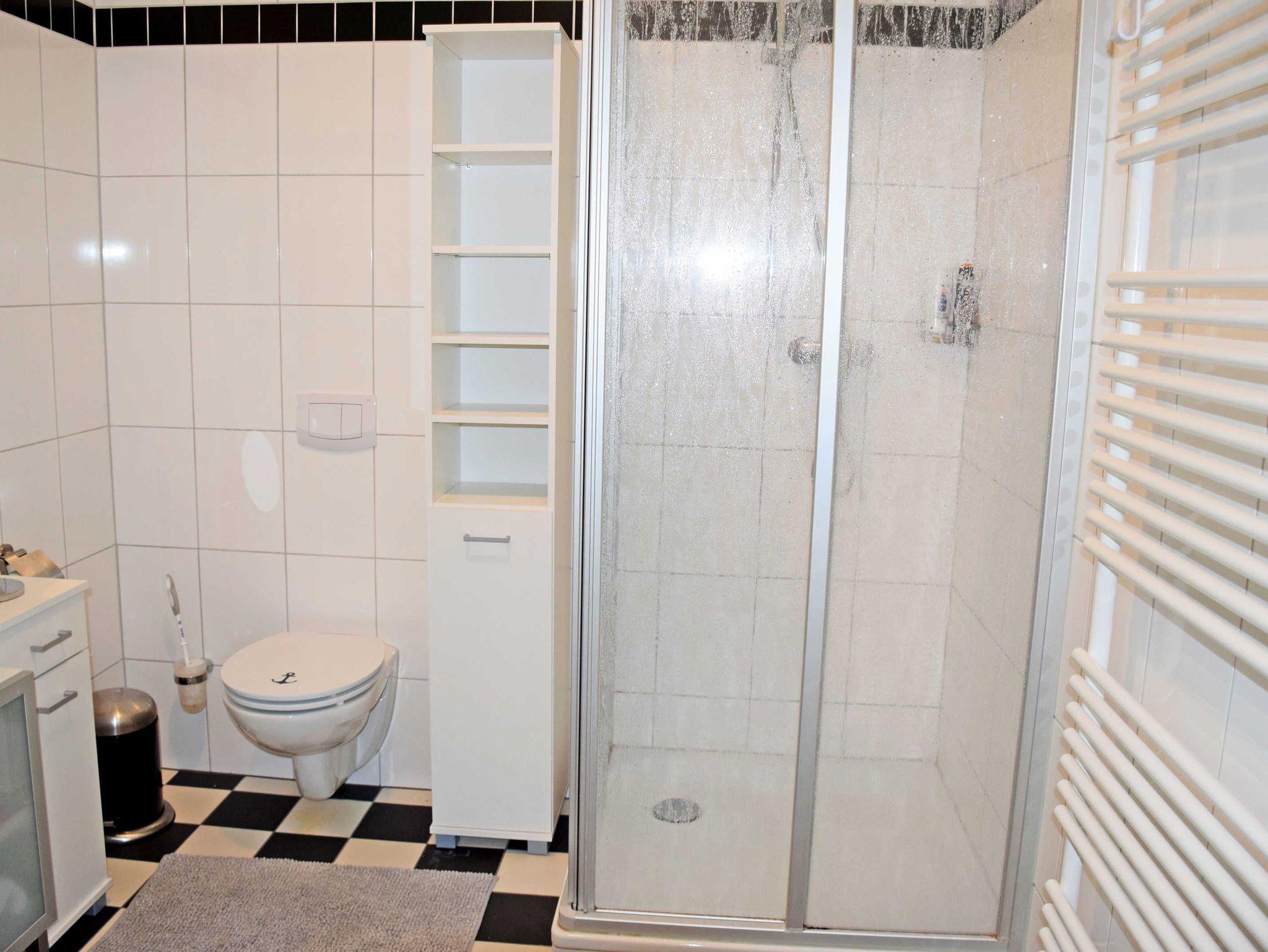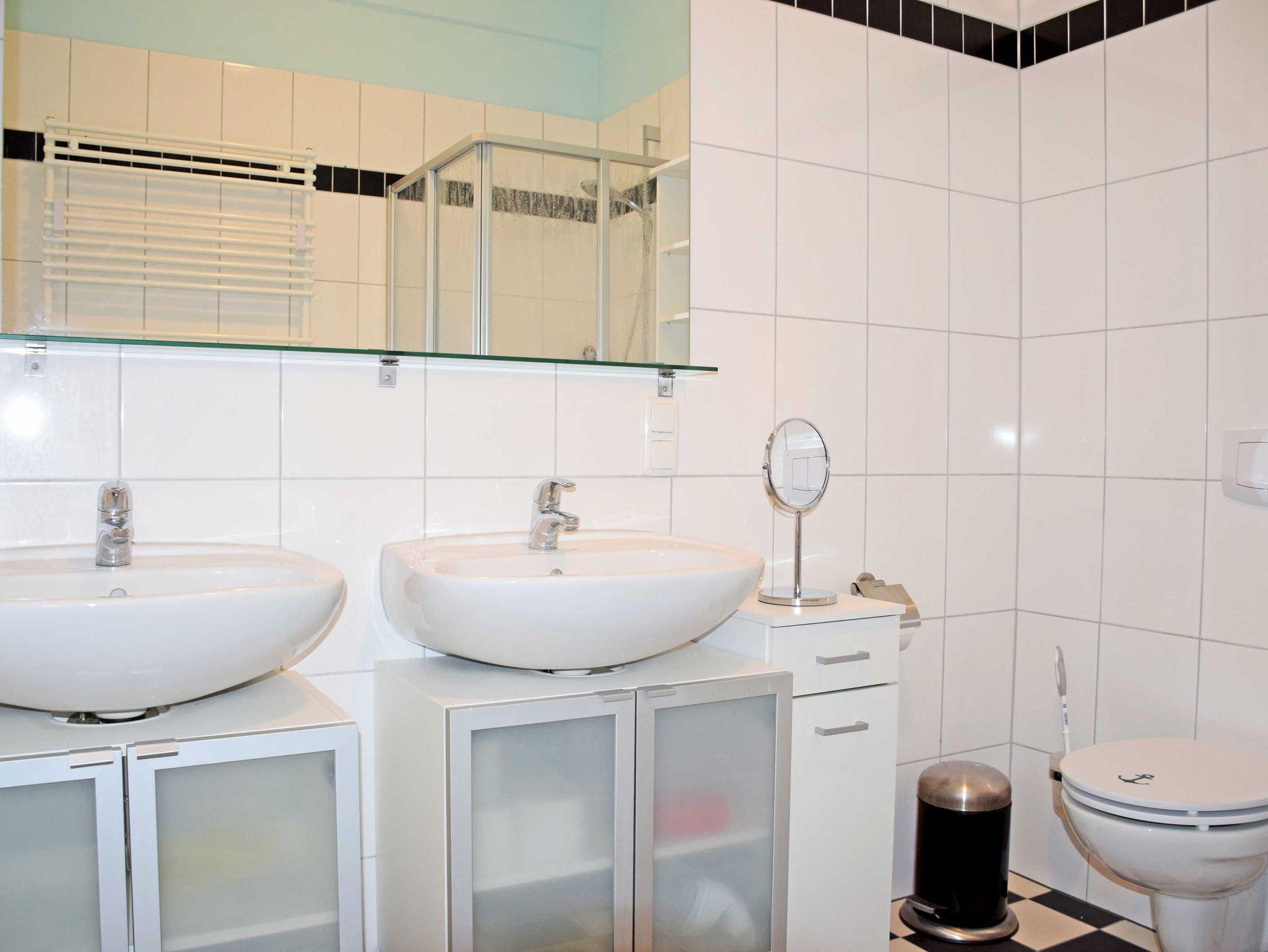 Das moderne Bad ist mit Dusche, WC und Doppel-Waschtisch ausgestattet.