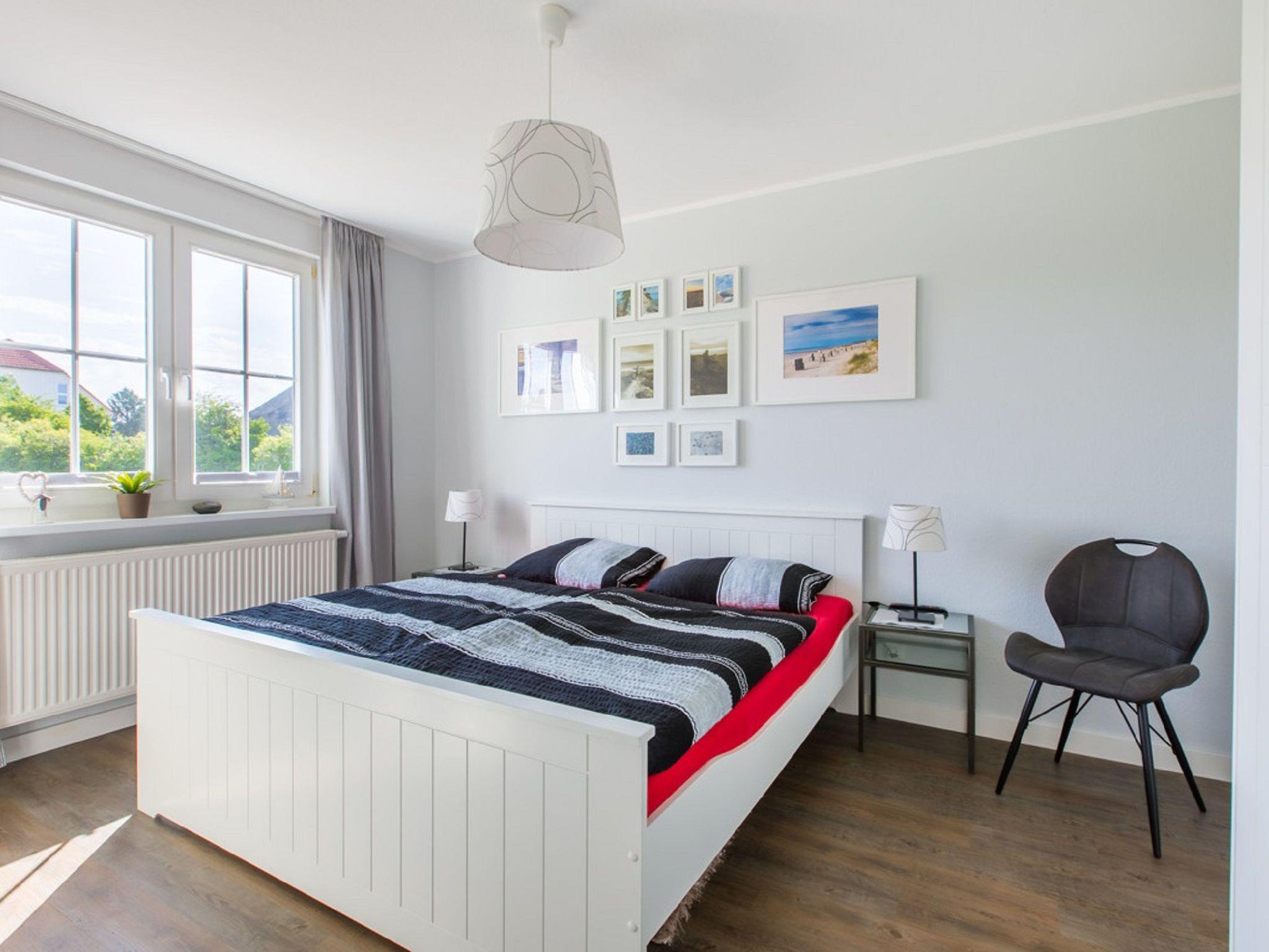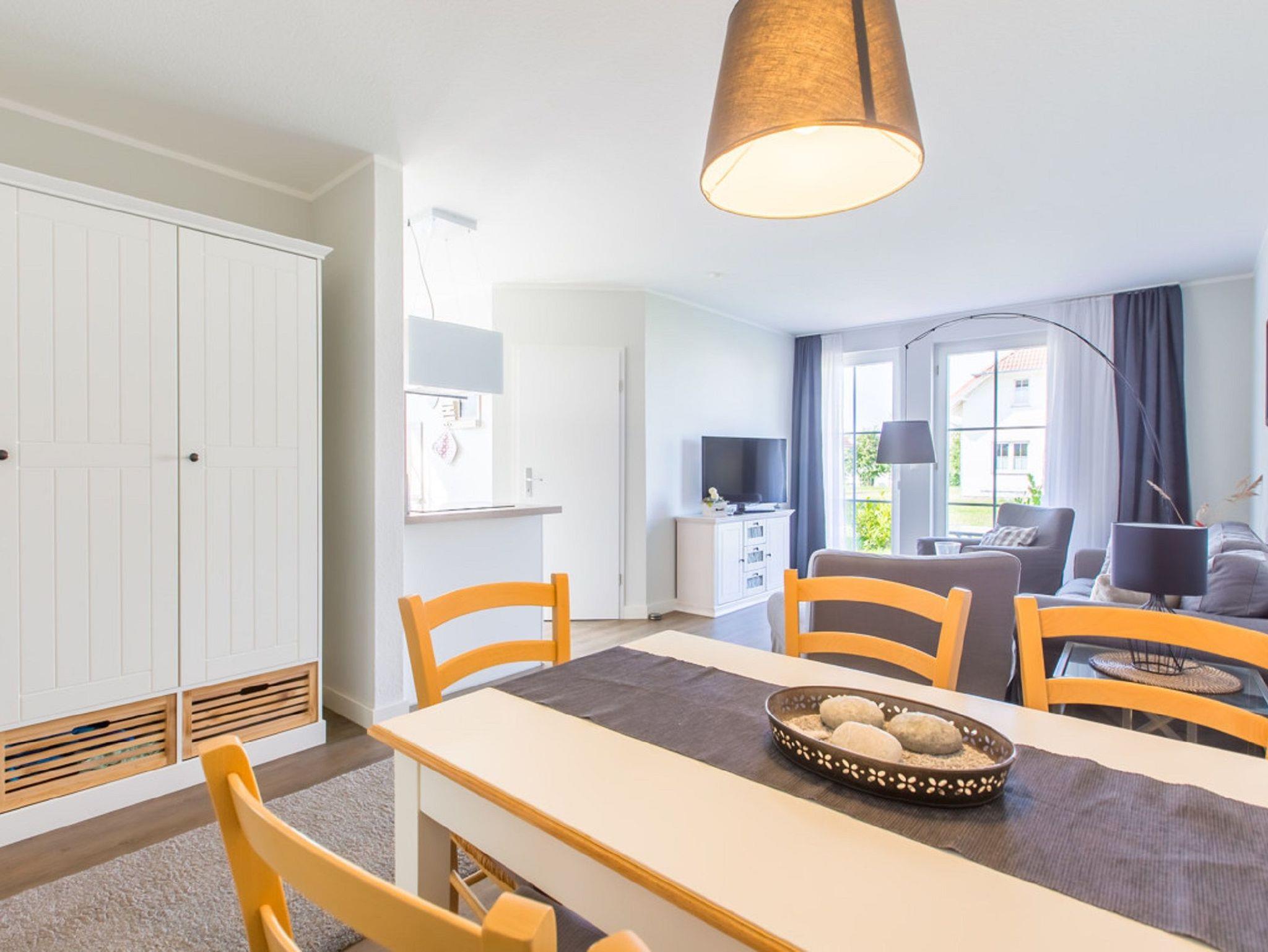 Die Fewo verfügt über zwei Schlafzimmer (1x Doppelbett 1,80 x 2,00m; 1x kl. Doppelbett 1,40 x 2,00m), ein Bad mit Dusche und ein Gäste-WC. Der Wohnbereich ist mit einer gemütlichen Couchecke und einem Essbereich in hellen Farben ausgestattet. Die Küche findet sich etwas abgetrennt, angrenzend an den Wohnbereich.