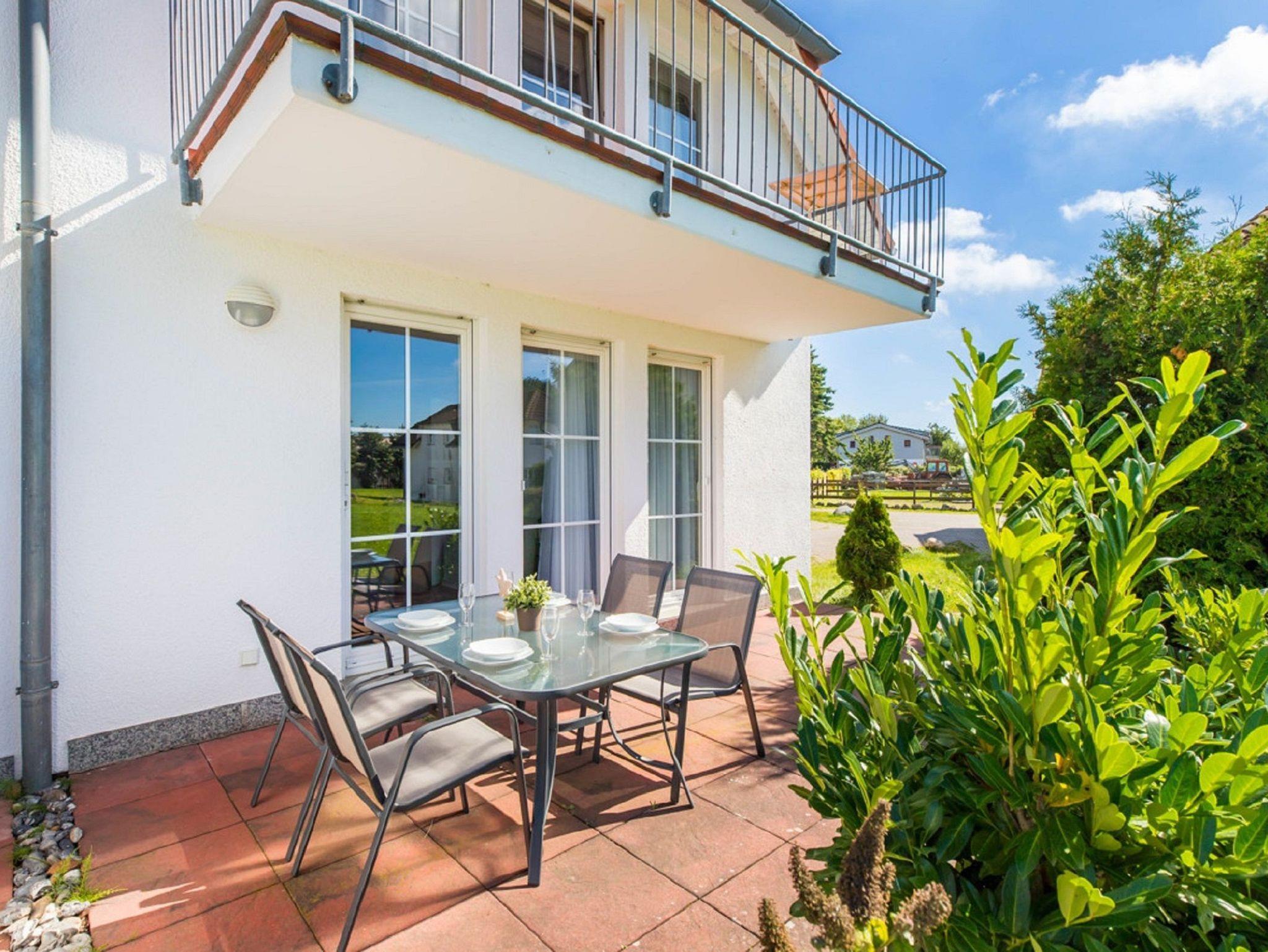 Die große Terrasse mit Gartenmöbeln und einem gemütlichen Strandkorb und Grill schließt an den Wohnbereich an.