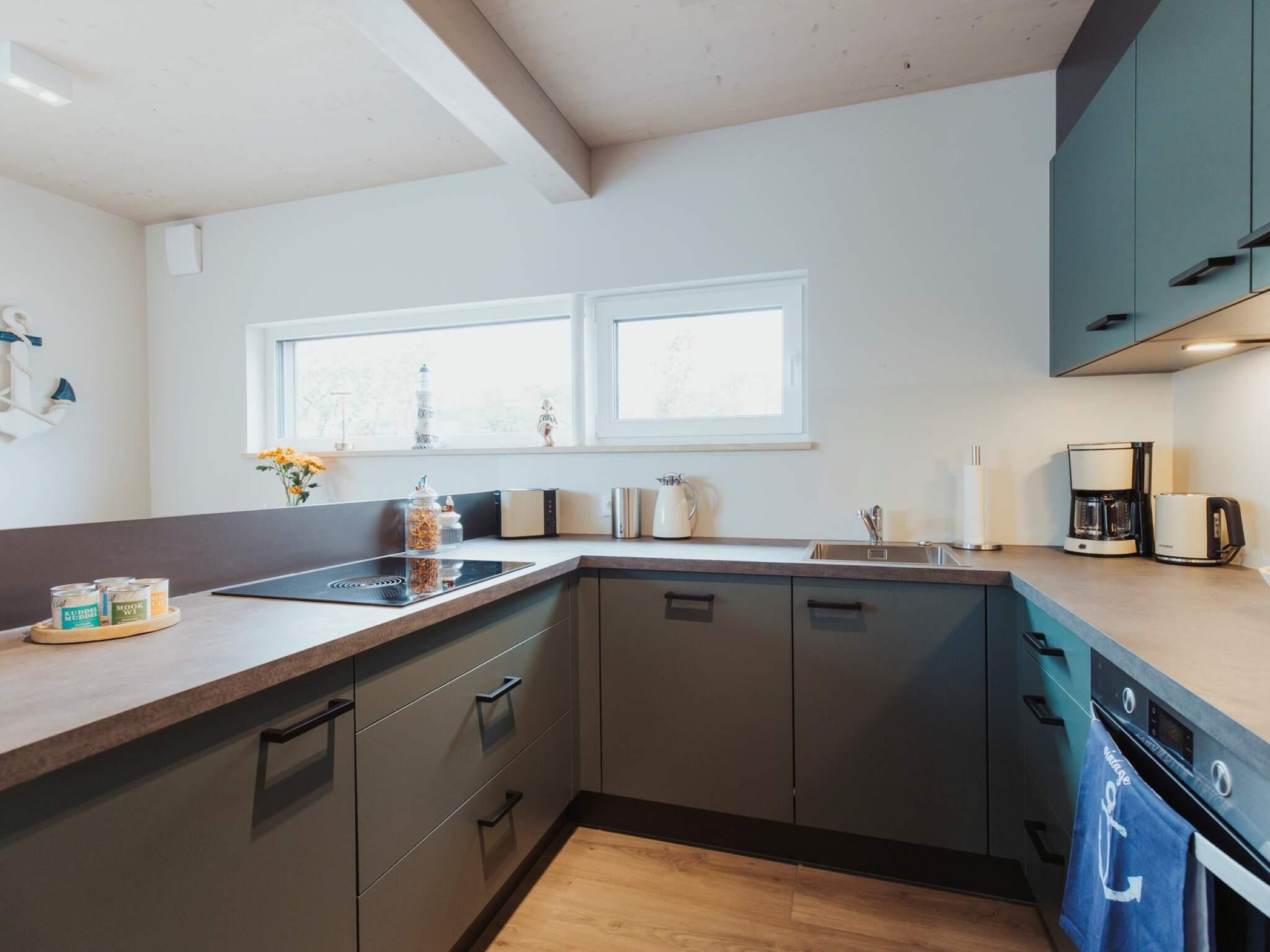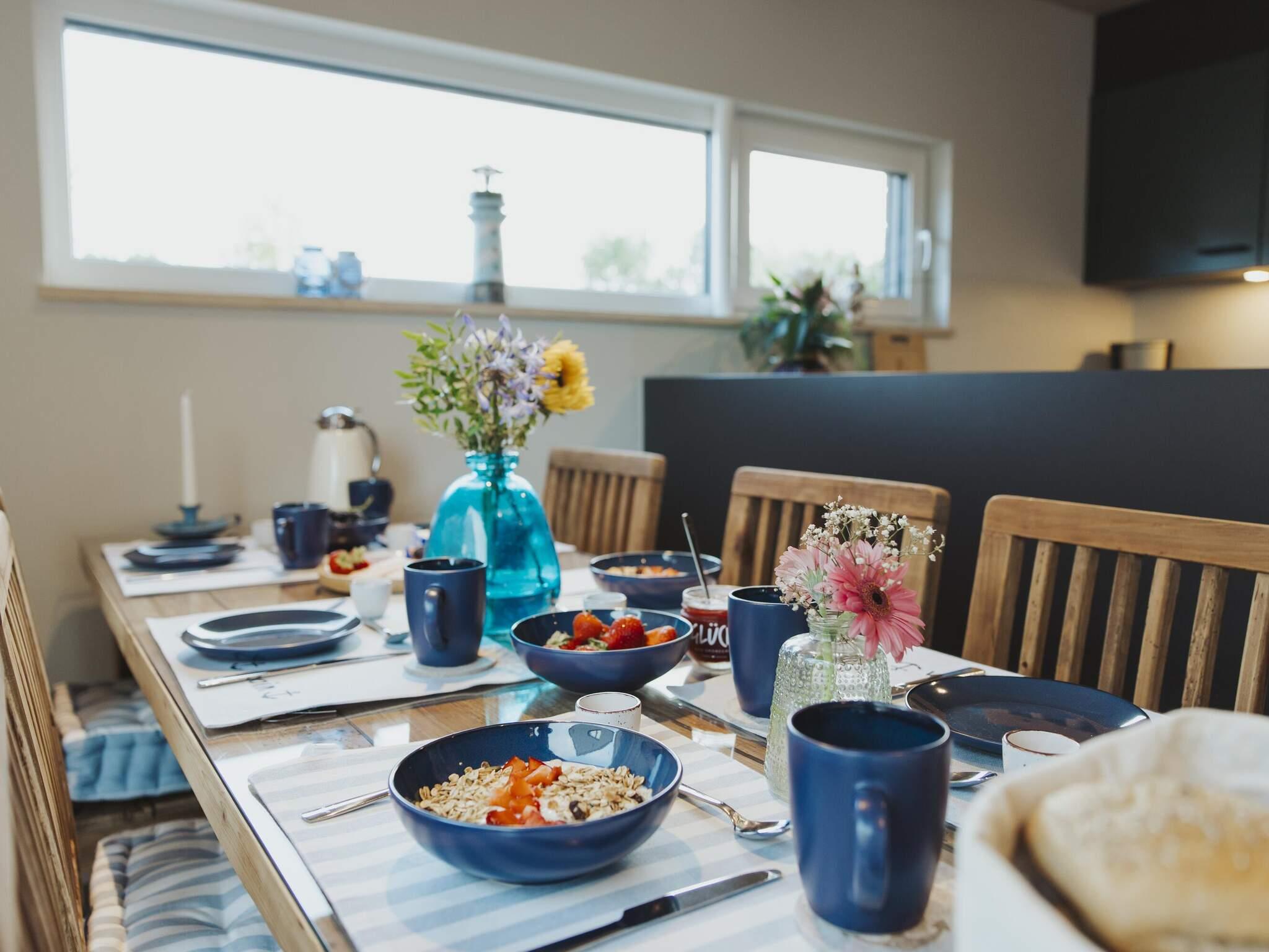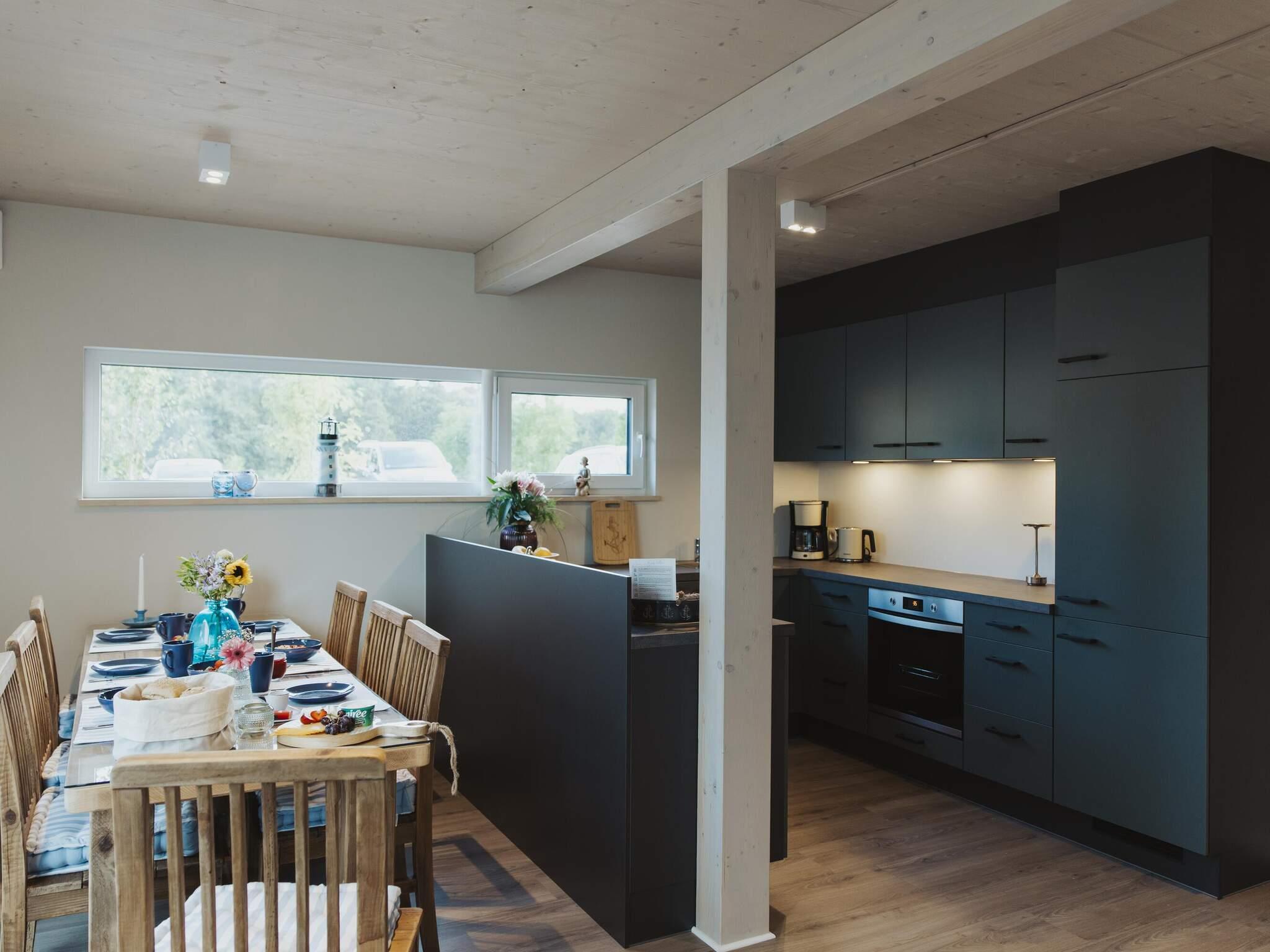 Hjertet i det hyggelige hus er den rummelige stue med siddehjørne og det store åbne køkken med tilstødende spisebord til syv personer. Køkkenet har en Bora-kogeplade, ovn og opvaskemaskine. Der er også service, håndklæder og gryder. Det handicapvenlige badeværelse med brusebad i gulvhøjde med glasvæg tilbyder højeste komfort.