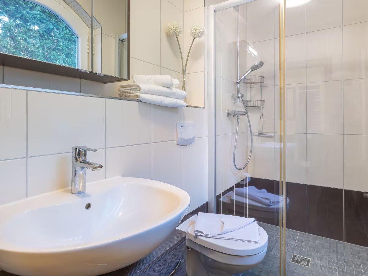 Details wie spezialbeschichtete Flächen in den Bädern und eine Enthärtungsanlage für das Wasser sind in diesem Haus selbstverständlich. Für das gesamte Interieur wurden echte Materialien gewählt – hier sind es Massivholzmöbel und Ausstattungsgegenstände deutscher Markenfabrikation von Duravit, Hansa, WMF, Ritzenhoff-Breker oder Leonardo. Der hochwertige Ampelschirm von Zangenberg spendet Schatten auf der Terrasse. Nach Wanderungen in der kühleren Jahreszeit spendet ein Kaminofen mit Glasfenster wohlige Wärme. Kaminholz wird kostenfrei zur Verfügung gestellt.