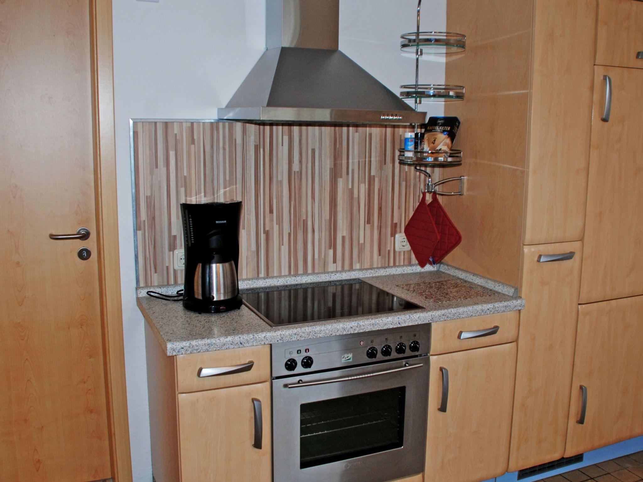 Die separate Küche ist mit einem 4- Zonen-Ceranfeld-Herd, Abzugshaube, Backofen, Spülmaschine, Wasserkocher, Mikrowelle, Kaffeemaschine, Toaster und Kühlschrank mit Gefrierfach komplett ausgestattet.