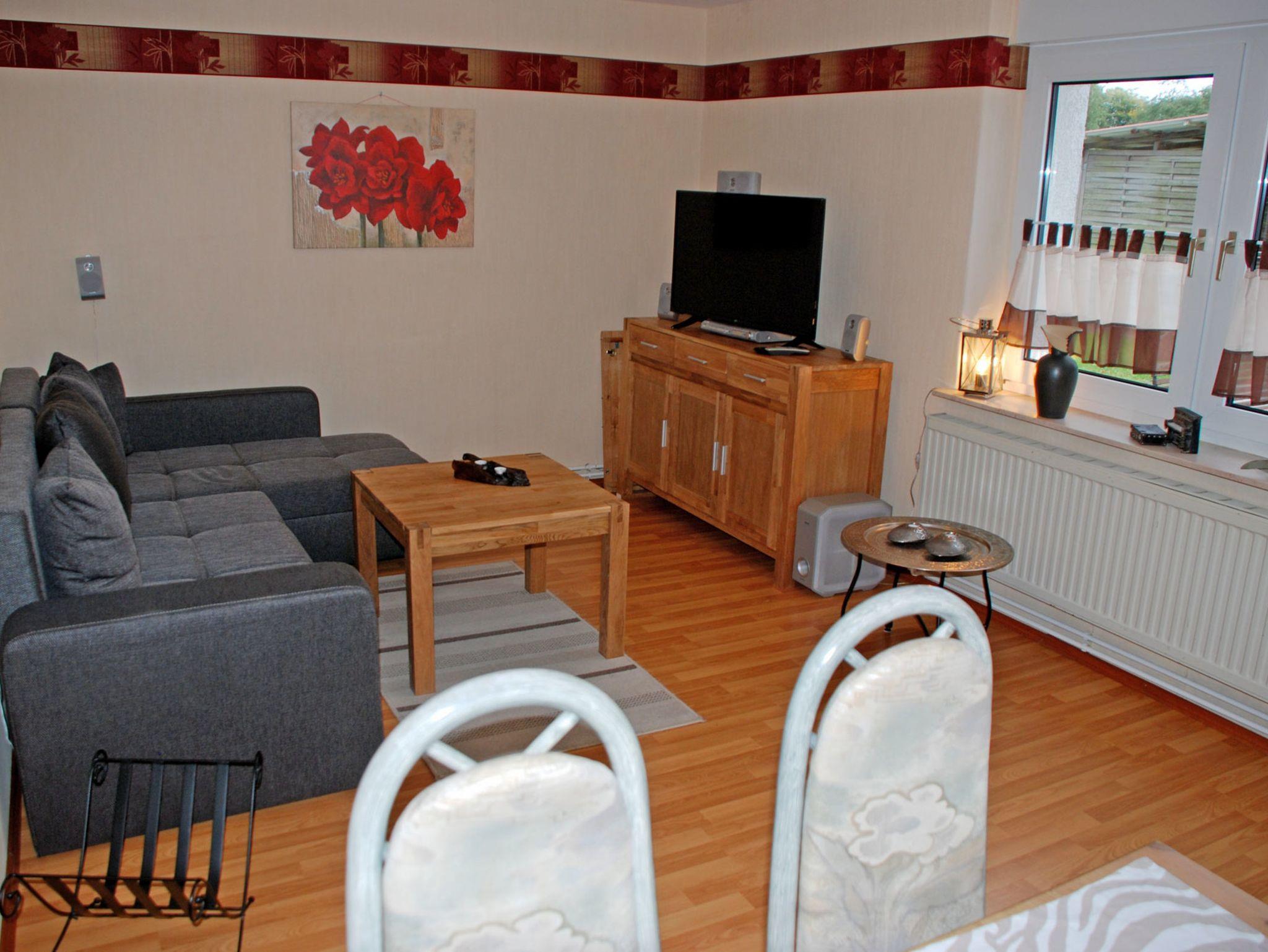 Die Ferienwohnung im Erdgeschoss verfügt über einen separaten Eingang. Sie ist ca. 70 qm groß, hat Platz für maximal 5 Gäste, wurde modern und liebevoll eingerichtet und bietet ein WLAN-Internetzugang. Im Wohnraum befinden sich eine bequeme Couch mit Tisch und ein modernes Flachbild-TV-Gerät mit Surroundanlge und DVD-Player. Hier steht auch ein Esstisch mit Stühlen. Die Couch kann bei Bedarf für zwei Gäste aufgebettet werden.