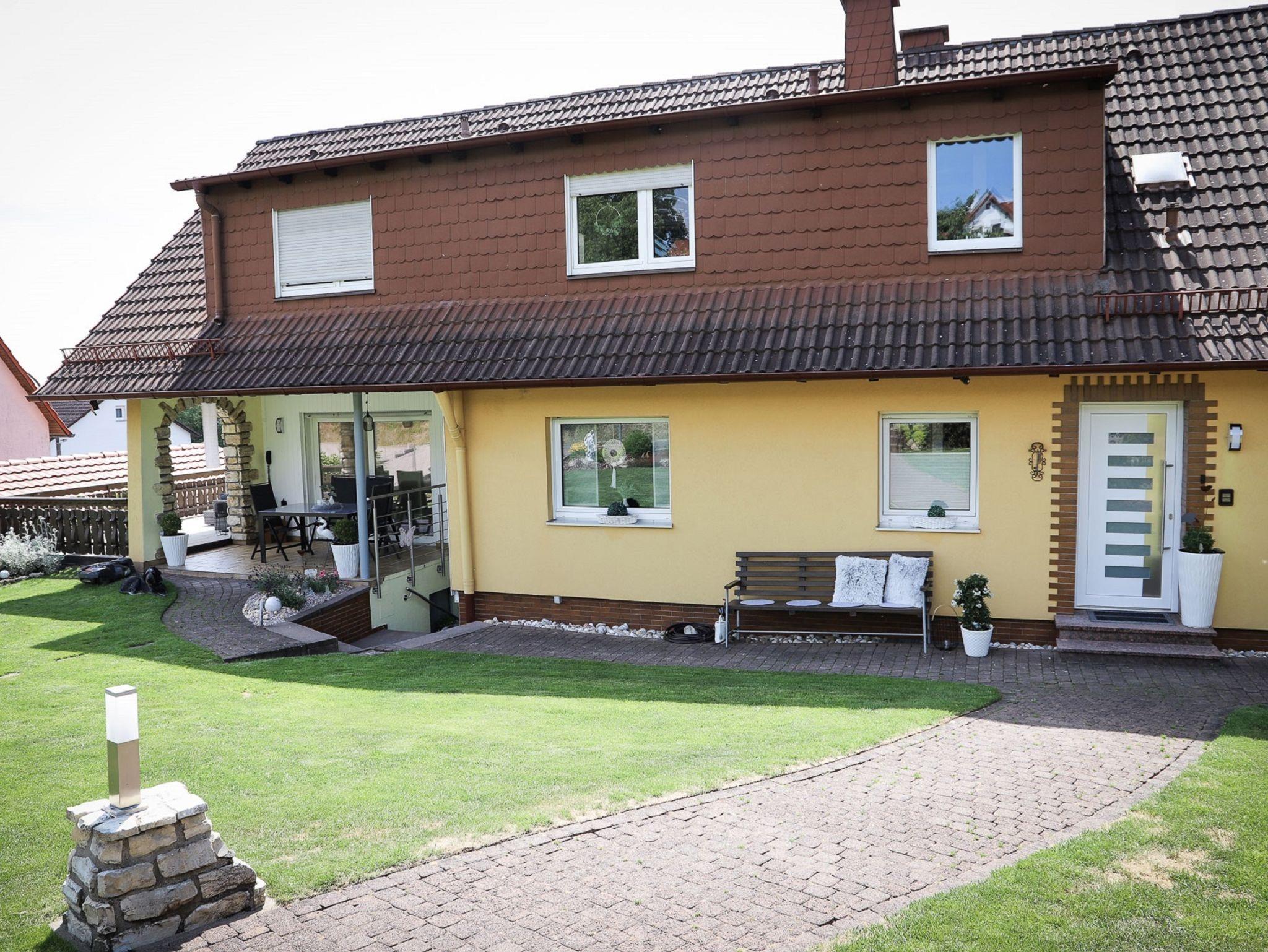 Die Ferienwohnung bietet auf 95 Quadratmetern Platz für bis zu 4 Personen. Der große offene Wohn-Essbereich ist ausgestattet mit einer schönen Wohnlandschaft, Sideboard, Flachbildschirm, akzentvoller Fliesenwand mit gemütlichen Flair und einer großer Schiebetür zur Terrasse. Der Essbereich verfügt über einen Tisch mit vier Stühlen, Kuschelsofa (160*200 cm) zum Ausziehen sowie einem Beistelltisch mit Leselampe, Hängeschrank mit diversen Büchern und Spielen für Groß und Klein. Die komplett eingerichtete Einbauküche inklusive Spülmaschine verfügt über Kaffeemaschine, Nespresso-Tab-Maschine (zwei Kapseln pro Tag inklusive) Kühlschrank mit Gefrierfach, Backofen, Mikrowelle, Toaster, Eierkocher und vieles mehr. Eine kleine Sitzecke rundet das ganze ab. Der große Schlafraum mit Blick ins Grüne verfügt über ein Bett (200*200cm), zwei Nachttischchen aus Glas, Leselampen, Kleiderschrank, stilvollen Kleiderhaken, Schirm und zwei Bademäntel zum Relaxen. Das moderne Badezimmer verfügt über eine bodenebene Dusche mit Massagefunktion, Toilette, Waschtisch mit Schrank, Shampoo- und Duschgelspender, Flüssigseife, Handcreme sowie Föhn. Unsere Ferienwohnung ist komplett mit Ölheizung ausgestattet, alle Fenster haben Rollos, teilweise elektrisch. Unter der überdachten Terrasse kann man bei einem Gläschen Wein und leckerem Essen den Abend ausklingen lassen. Ein Tisch mit vier Stühlen, zwei Sonnenliegen und einer großen Lounge, sowie einem Holzkohlengrill, stehen im Außenbereich zur Verfügung. Auf Anfrage kann im voll ausgestattetem Waschkeller die Waschmaschine genutzt werden.