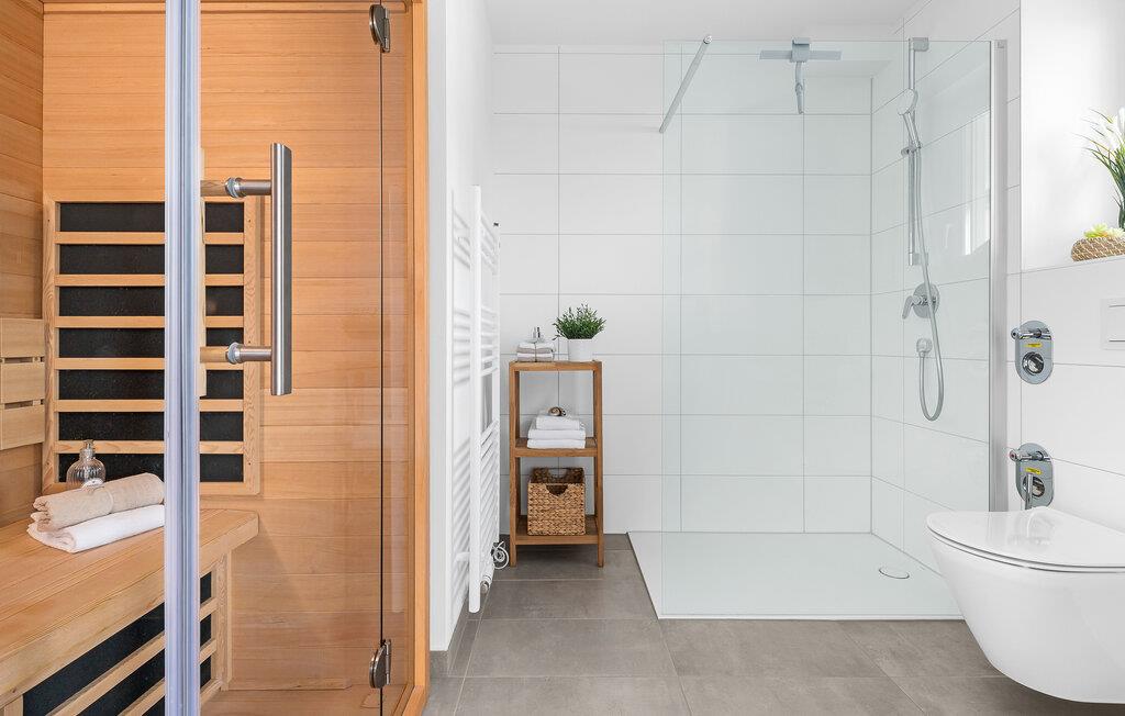 Designerbadeværelset er jeres helt private wellness-område. En regnbruser på gulvniveau og en infrarød sauna venter på jer her. Hvad kunne være bedre efter en solskinsdag på stranden eller en stormfuld gåtur? Med så mange faciliteter tilbyder SANDDORN naturligvis også en parkeringsplads lige ud til huset.