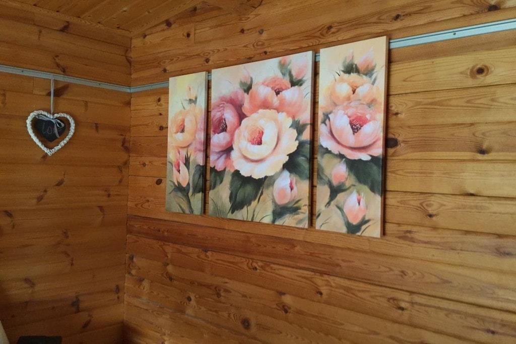 Stueetage: (entre(, , varme), Stue(, enkeltsovesofa, Fjernsyn, pejs, varme), spisestue(spisebord, varme), soveværelse(, , enkeltseng, enkeltseng, Fjernsyn), soveværelse(dobbeltseng), badeværelse(, toilet, badekar, bruser, håndvask, varme), badeværelse(, toilet, bruser, håndvask), havestue(spisebord)) , , , , garage, terrasse(, havemøbler, solstole), parkering, tørreskab