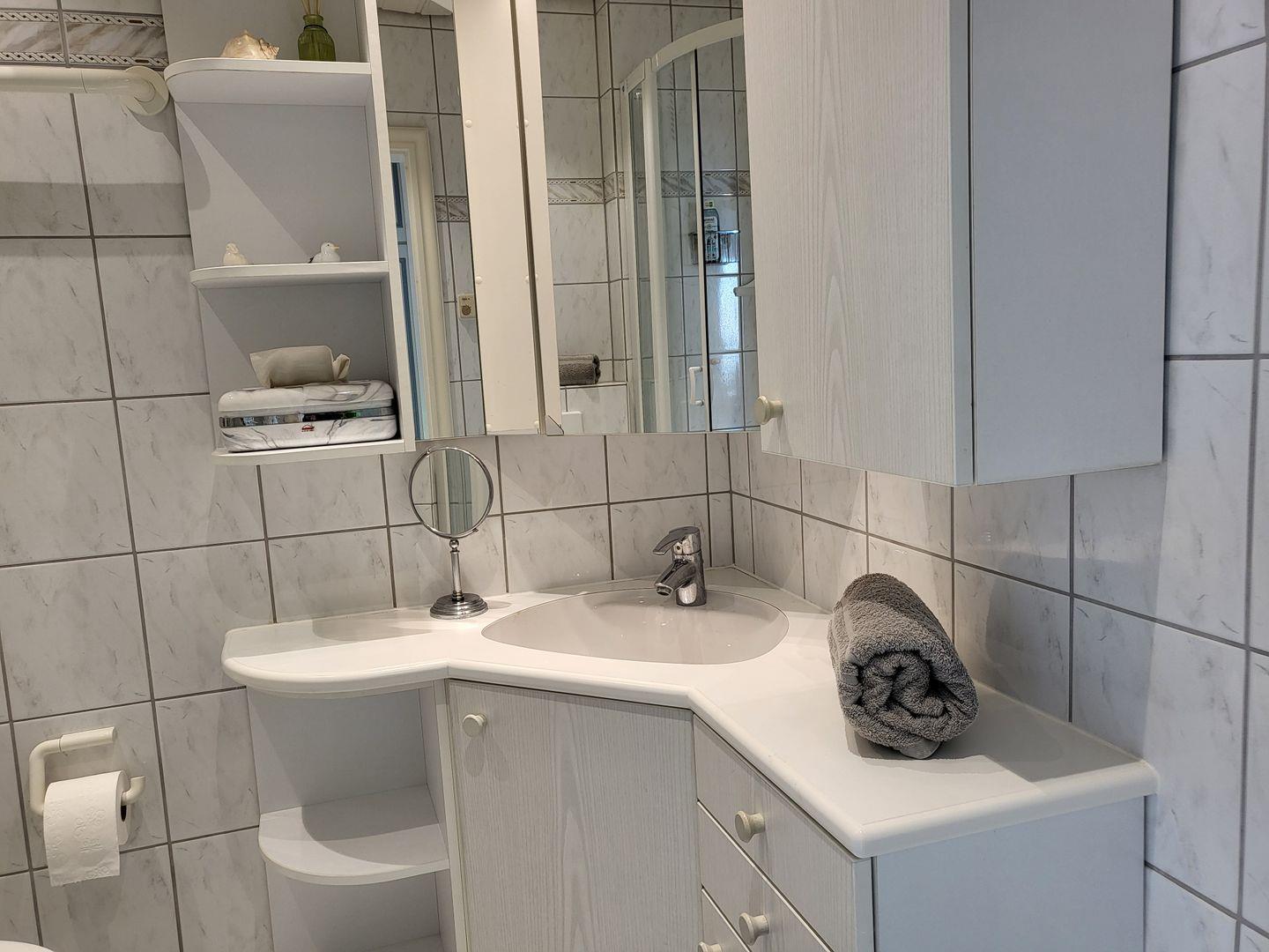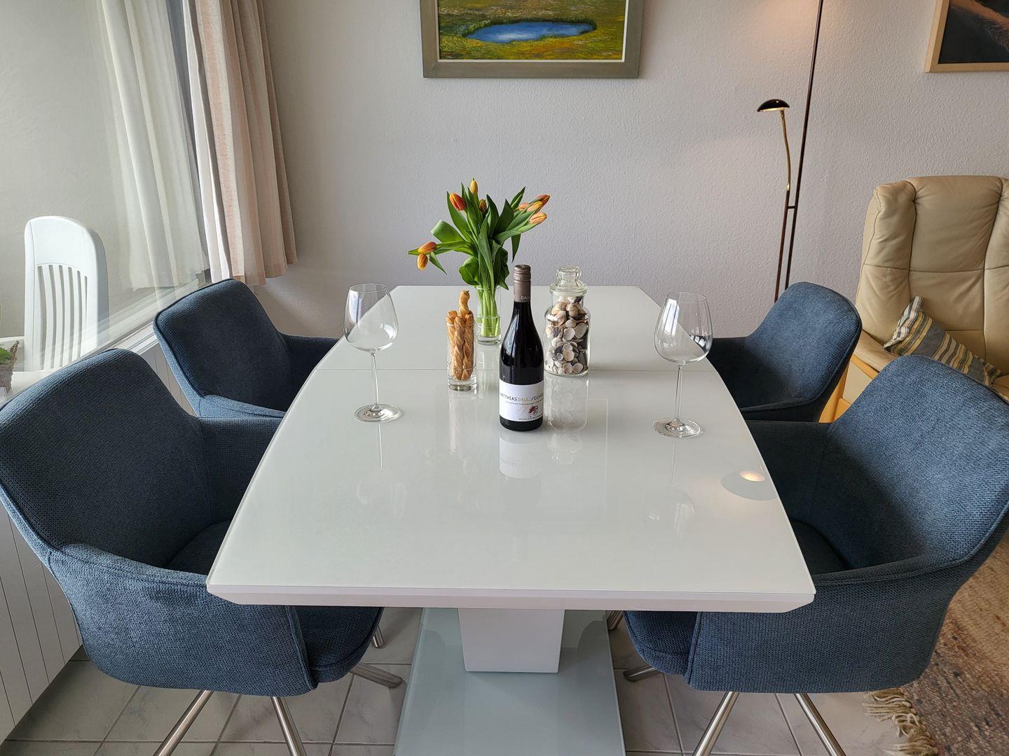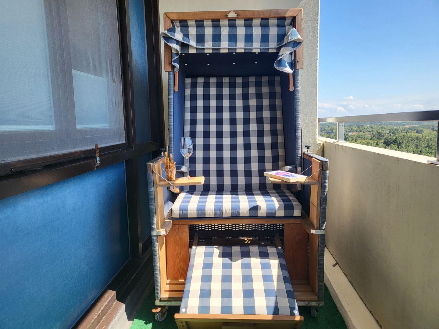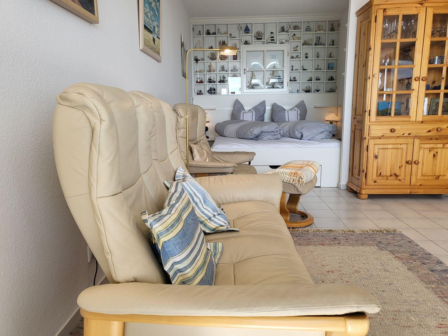 Balkon mit Strandkorb und Tisch mit 2 Stühlen. Auf insgesamt 47m² befindet sich ein großes Wohnzimmer mit Schlafnische und einem 160x190 cm breiten Doppelbett. Der Einstieg ist nur von einer Seite oder über das Fussende möglich. Ein weiteres Zimmer ist ausgestattet mit einem Einzelbett, einer Kommode. Beide Räume haben Verdunklungsrollos und Insektenschutzgitter, sodass auch im Sommer einem Ausschlafen nichts im Wege steht. Bequeme Stressless-Sitzmöbel sorgen für Entspannung nach langen Spaziergängen oder Fahrradtouren. Die Küche ist ausgestattet mit einem 4-Feld-Ceran-Kochfeld, Dunstabzugshaube, Backofen, Spülmaschine, Kühlschrank, Kaffeefiltermaschine, Nespressokapselmaschine, Wasserkocher und Toaster. Das renovierte Badezimmer mit Dusche glänzt durch einen Spiegelschrank mit viel Stauraum, einem Kosmetikspiegel und einem Haarföhn.