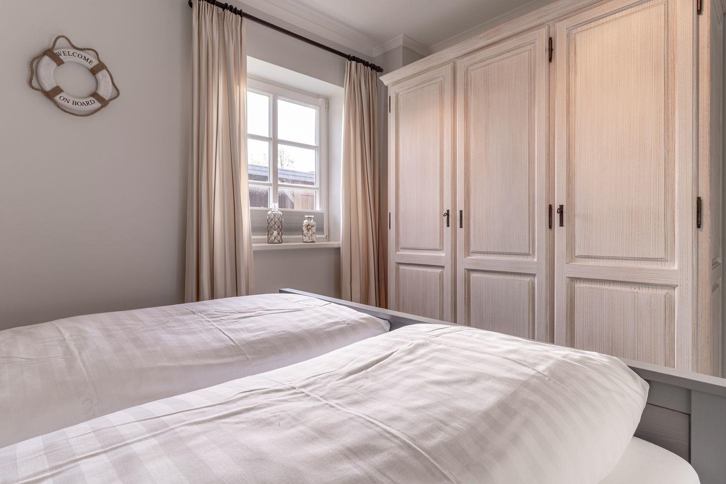 Über eine Holztreppe im Flur gelangt man in das Obergeschoss mit zwei Schlafzimmern. Eines verfügt über ein 180er Bett mit TV und das andere über 2 x 90er Einzelbetten. Außerdem ist im Obergeschoss ein Duschbad.