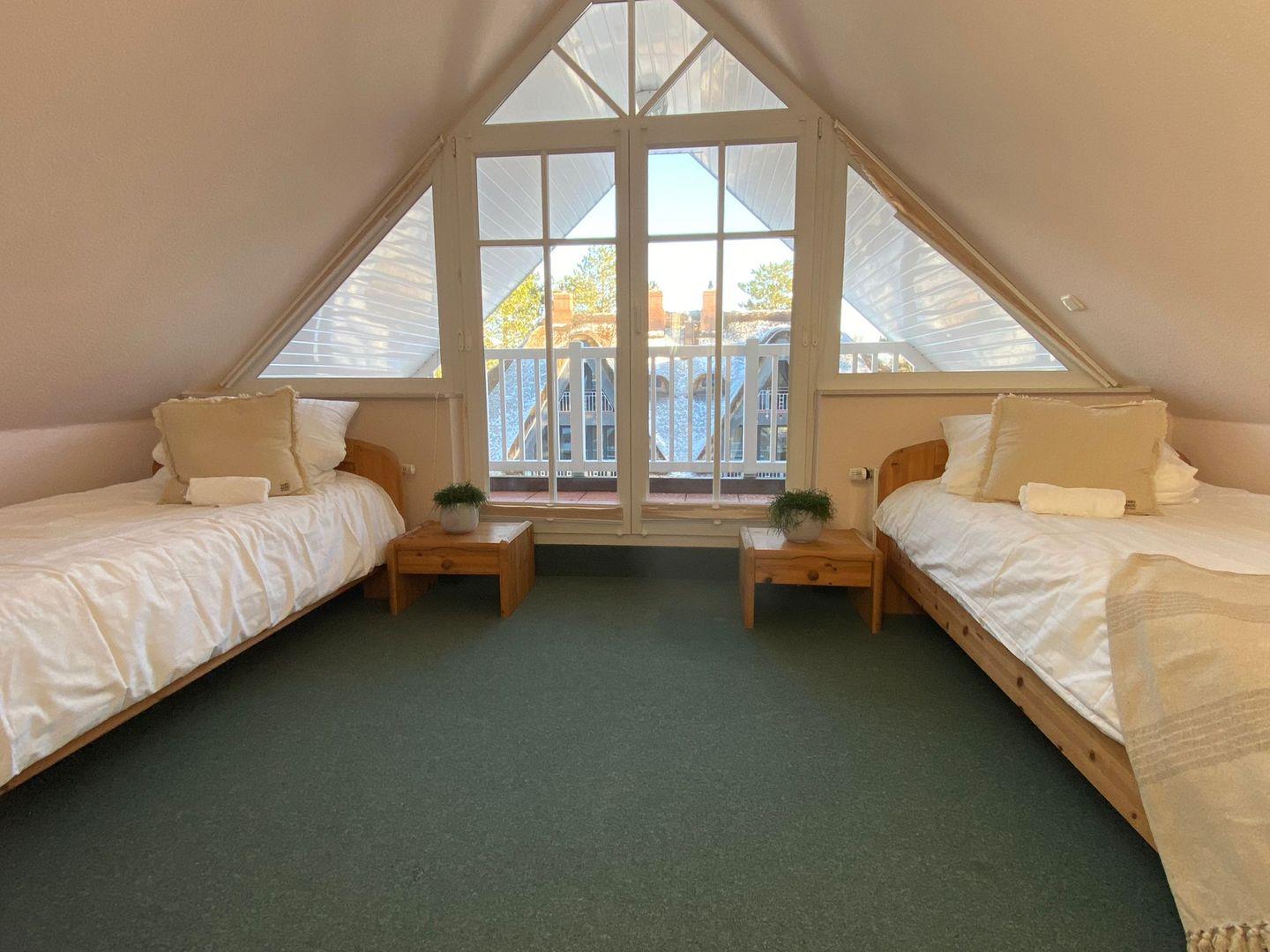 Nach einem ereignisreichen Tag finden Sie auf der ersten Ebene in einem der beiden Schlafzimmer mit Doppelbett (180 x 200 cm / getrennte Matratzen und Kleiderschrank) Ruhe. Das Tageslichtbad bietet Dusche, Handtuchheizung, Waschbecken, beleuchteten Spiegelschrank, Fön und WC. Ein weiteres abschließbares Schlafzimmer mit 2 Einzelbetten erwartet Sie auf der zweiten Ebene, zusammen mit einem weiteren Tageslichtbad mit Dusche, Handtuchheizung, Waschbecken, Spiegel, Haartrockner und WC.