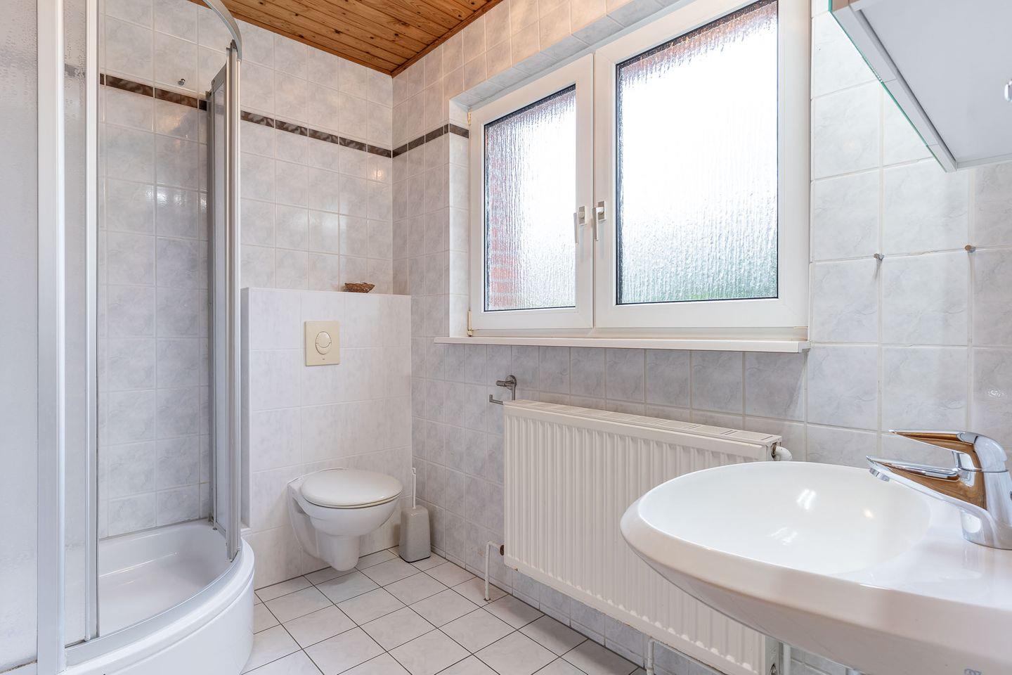 Badezimmer: Bodengleiche Dusche, WC, Pissoir und Waschbecken.