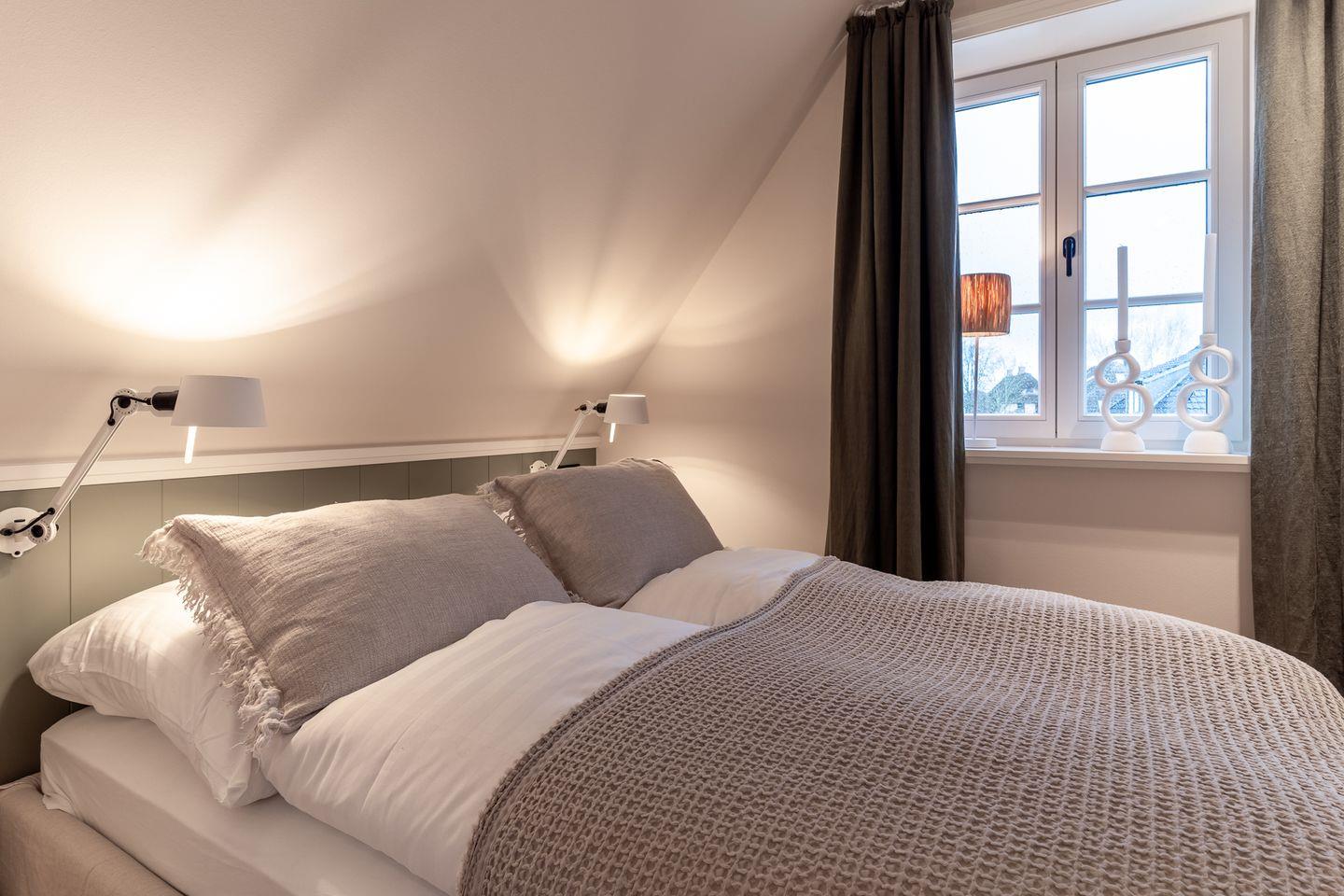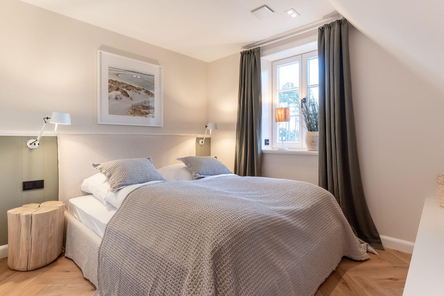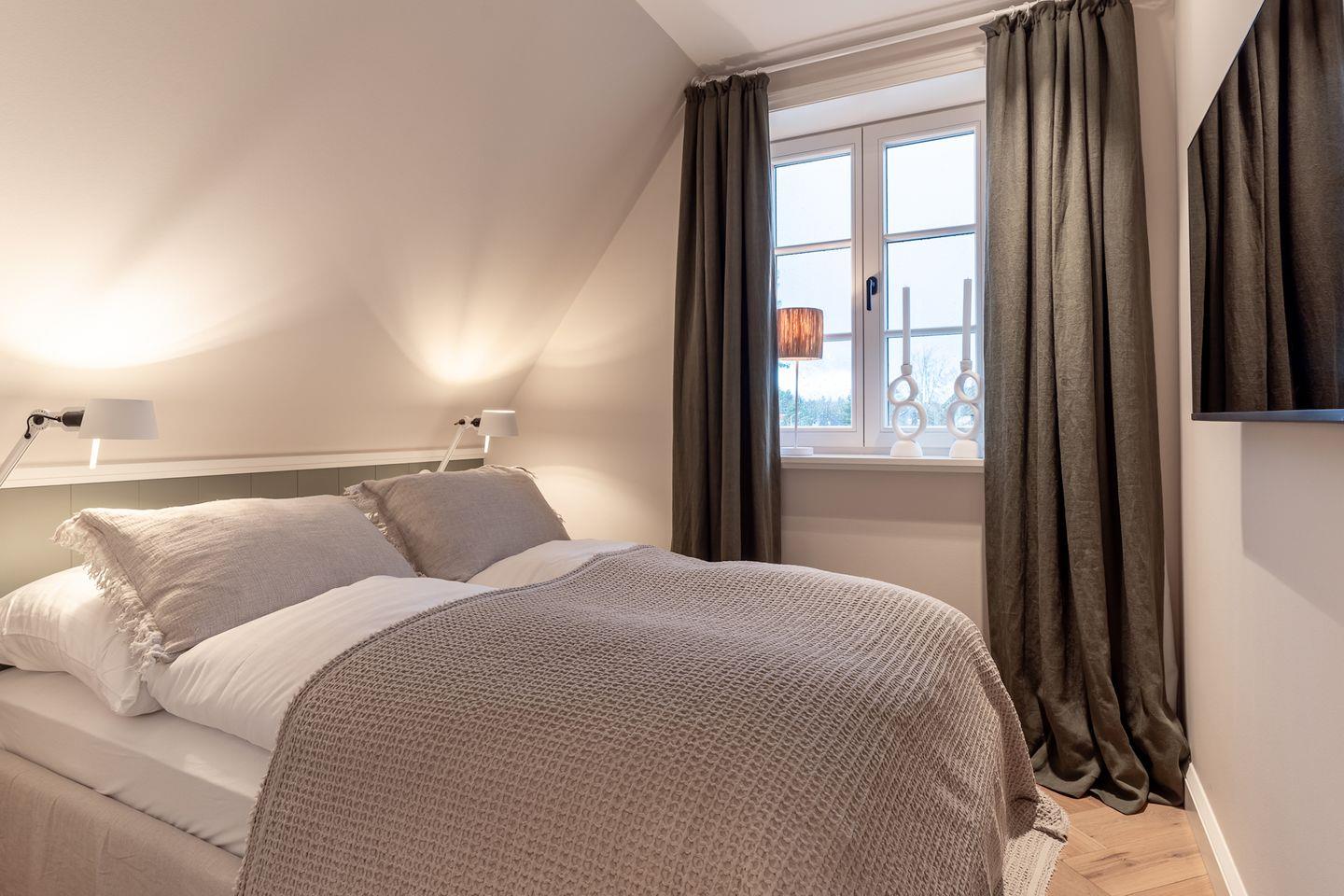 Über eine Holztreppe gelangt man in das Obergeschoss. Die zwei Schlafzimmer, jeweils mit einem Doppelbett 1x (1,60 x 2,00m) 1x (1,40 x 2,00m) sind mit einem TV und Kleiderschrank ausgestattet. Ein Schlafzimmer bietet Ihnen außerdem einen Schreibtisch.