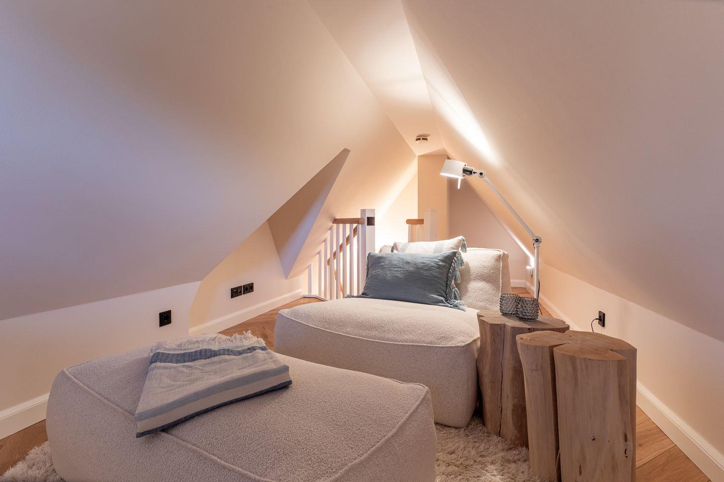 Darüber hinaus befindet sich im Obergeschoss ein geräumiges Vollbad mit Badewanne. Über den Flur gelangen Sie in das Dachgeschoss, hier ist ein gemütlicher Longe Bereich zum lesen, träumen, verweilen.
