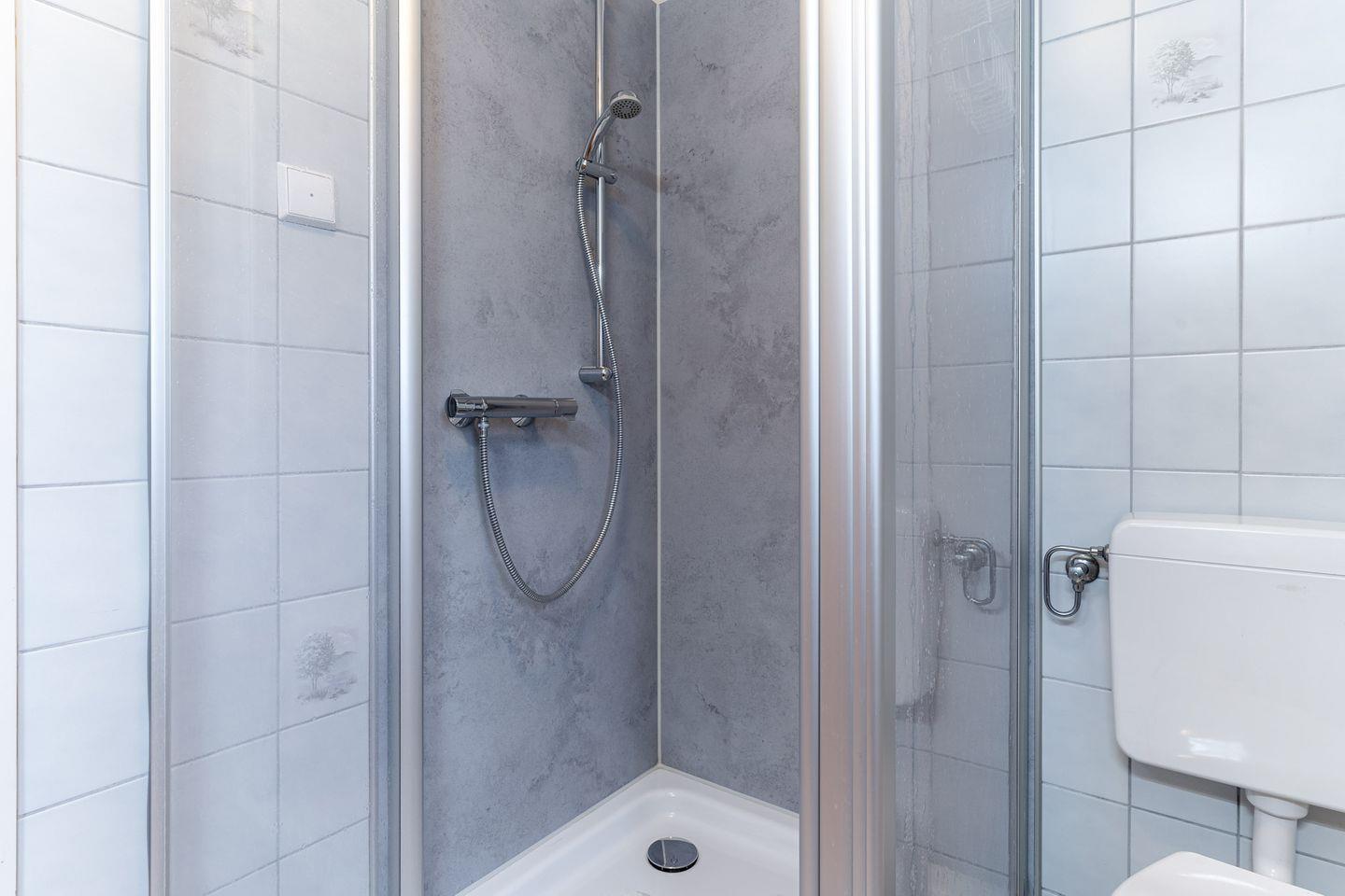 Das Schlafzimmer ist mit einem komfortablen Doppelbett (180x200 cm) ausgestattet, das für erholsame Nächte sorgt. Der Flur führt Sie zum modernen Duschbad mit WC, wo Sie sich nach einem Tag am Strand erfrischen können.