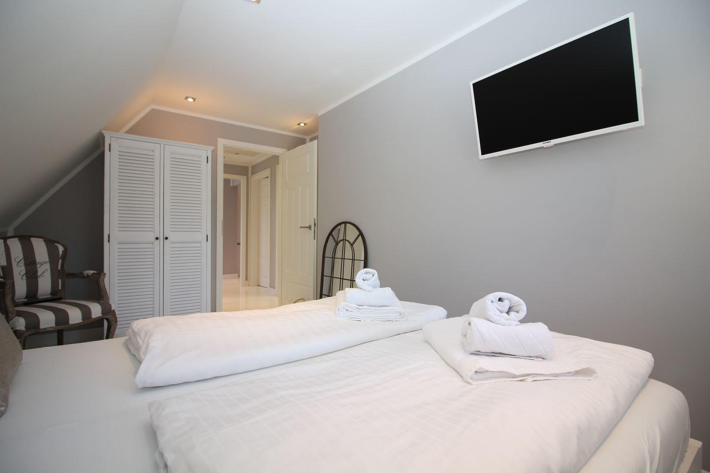 Das separate Schlafzimmer ist mit 2 Nachttischen, einem Kleiderschrank und einem Doppelbett (2,00 x 1,60 m) ausgestattet. Zudem bietet das Objekt ein anliegendes Arbeitszimmer zur offenen Küche, wo sich ein Schlafsofa für eine weitere Person (2,00 x 1,40) befindet. Das Badezimmer verfügt über eine Dusche, ein Waschbecken und ein WC. Zur Unterhaltung stehen zwei Sat-TVs Flachbildschirm im Wohnzimmer und einer in einem Schlafzimmer, ein Radio und kostenfreies WLAN zur Verfügung.