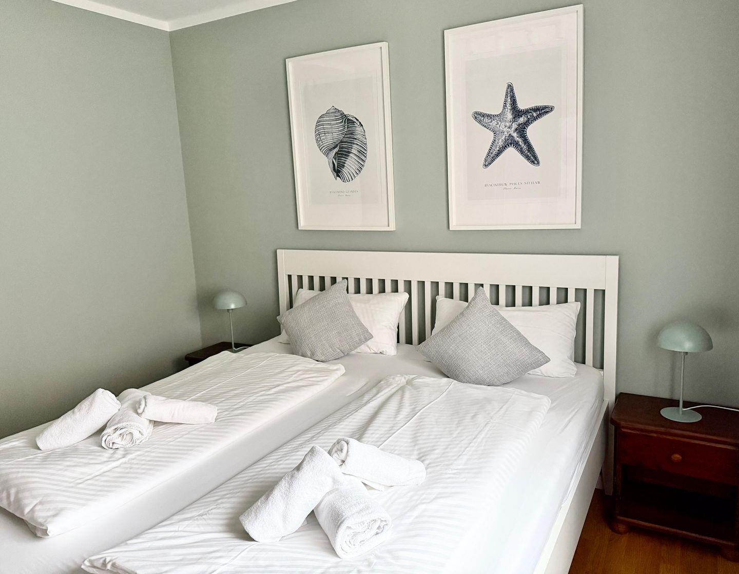 Mit zwei Schlafzimmern mit Doppelbetten(180x200cm und 140x200cm), einer separaten Küche und einem Duschbad mit WC, bietet die Dreizimmerwohnung 4 Personen eine schöne Ferienunterkunft nahe Zum Südstrand.