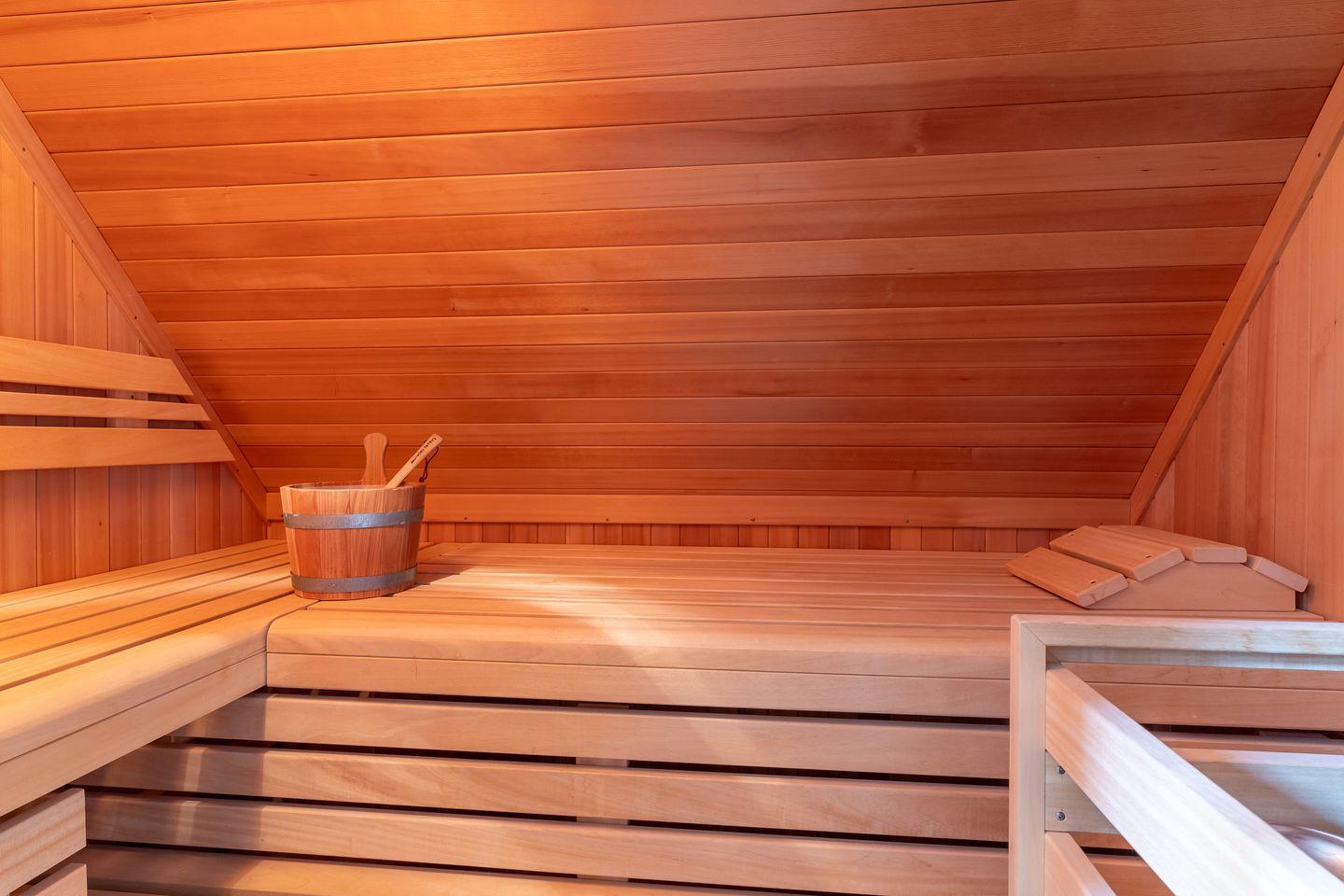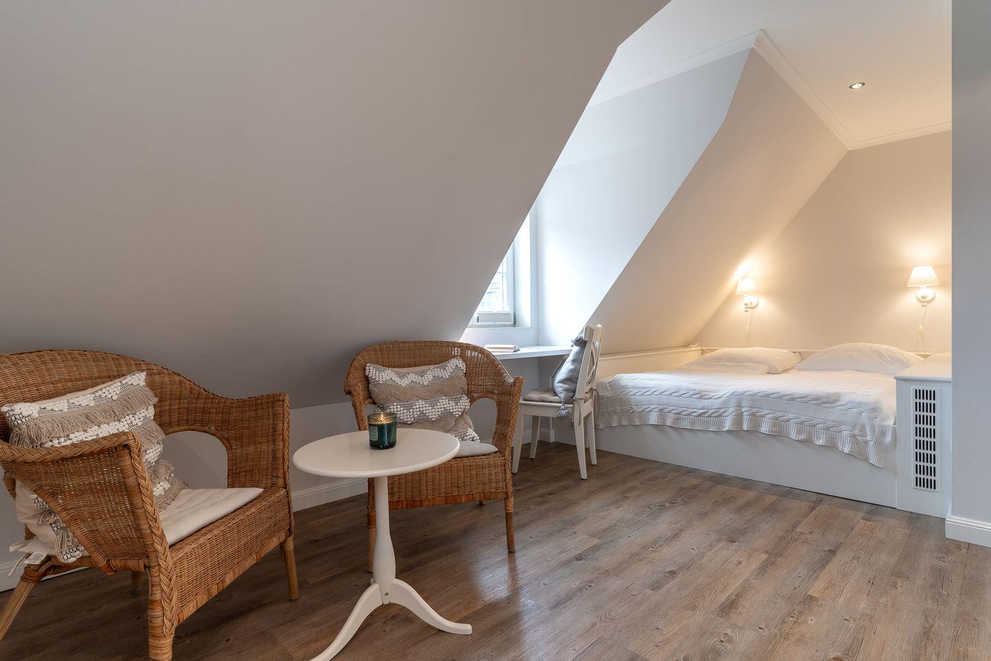 Obergeschoss: ein separater Arbeitsbereich mit Schreibtisch, ein Schlafzimmer mit Doppelbett (180 x 200 cm), Sitzecke und Arbeitsplatz, ein Schlafzimmer mit Einzelbett (80 x 200 cm), Sitzecke und Arbeitsplatz, ein Schlafzimmer mit Einzelbett (80 x 200 cm), ein Duschbad / WC mit angegliederter Sauna, ein separates Gäste-WC
