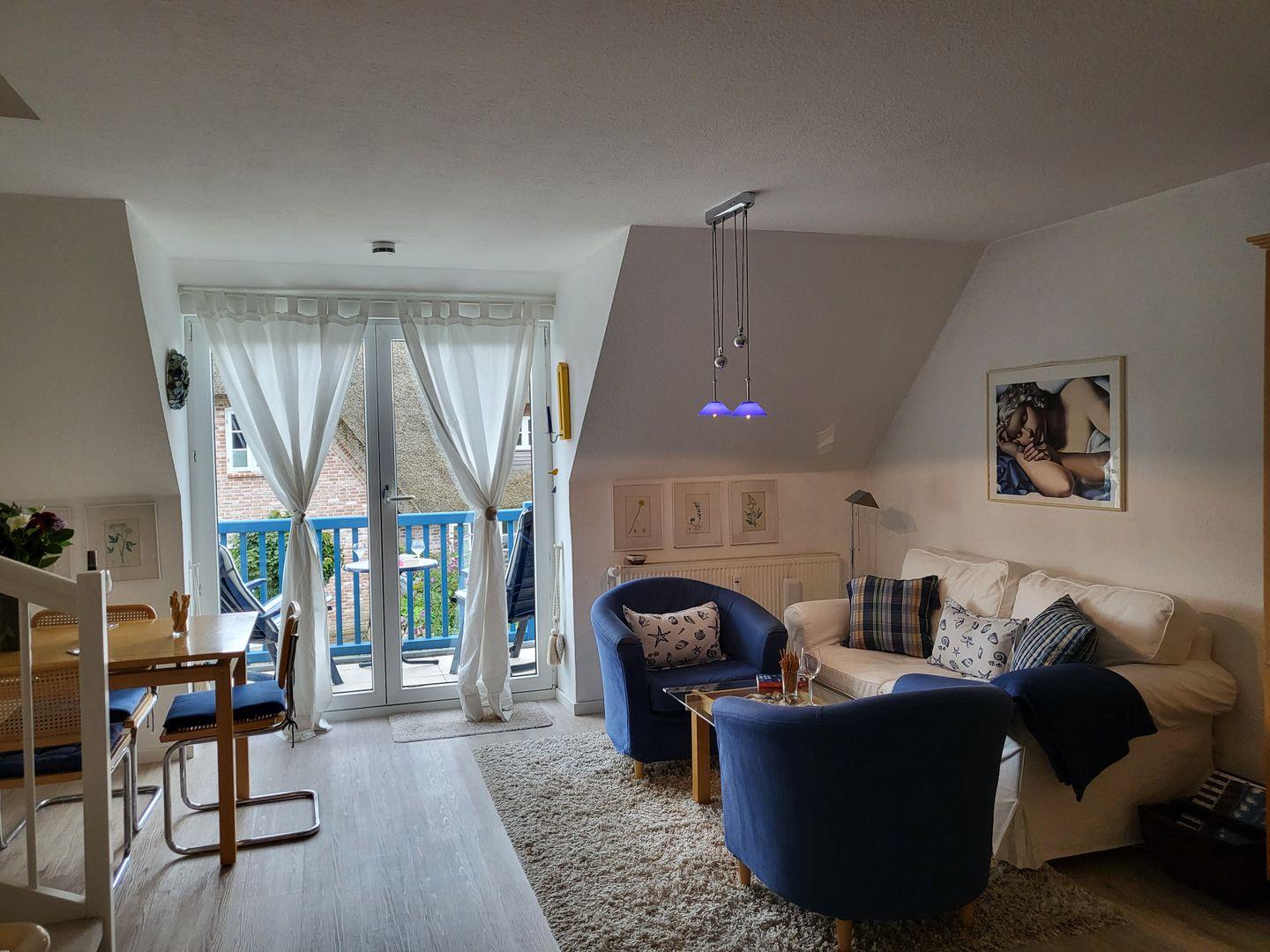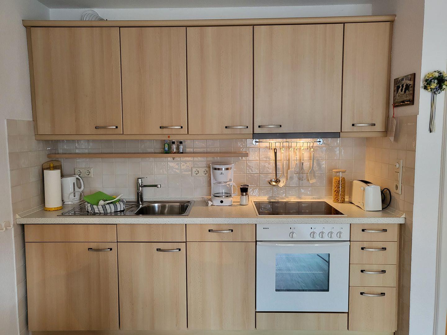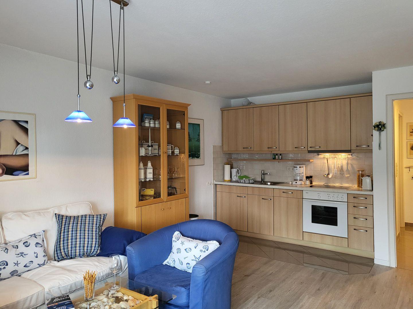 Die Ferienwohnung befindet sich im ersten Stock und begeistert mit ihrem offenen Wohnkonzept. Der großzügige Wohnbereich mit einer gemütlichen Sofaecke lädt zum Entspannen ein und bietet Ihnen die Möglichkeit, nach einem erlebnisreichen Tag bei einem guten Film auf dem Fernseher oder mit Ihrer Lieblingsmusik von der HiFi-Anlage abzuschalten. Der angrenzende Essbereich ist ideal für gemeinsame Mahlzeiten, die Sie in der voll ausgestatteten Küche zubereiten können. Hier stehen Ihnen alle modernen Annehmlichkeiten zur Verfügung, darunter ein Cerankochfeld, ein Backofen, eine Spülmaschine und eine Kaffeemaschine.