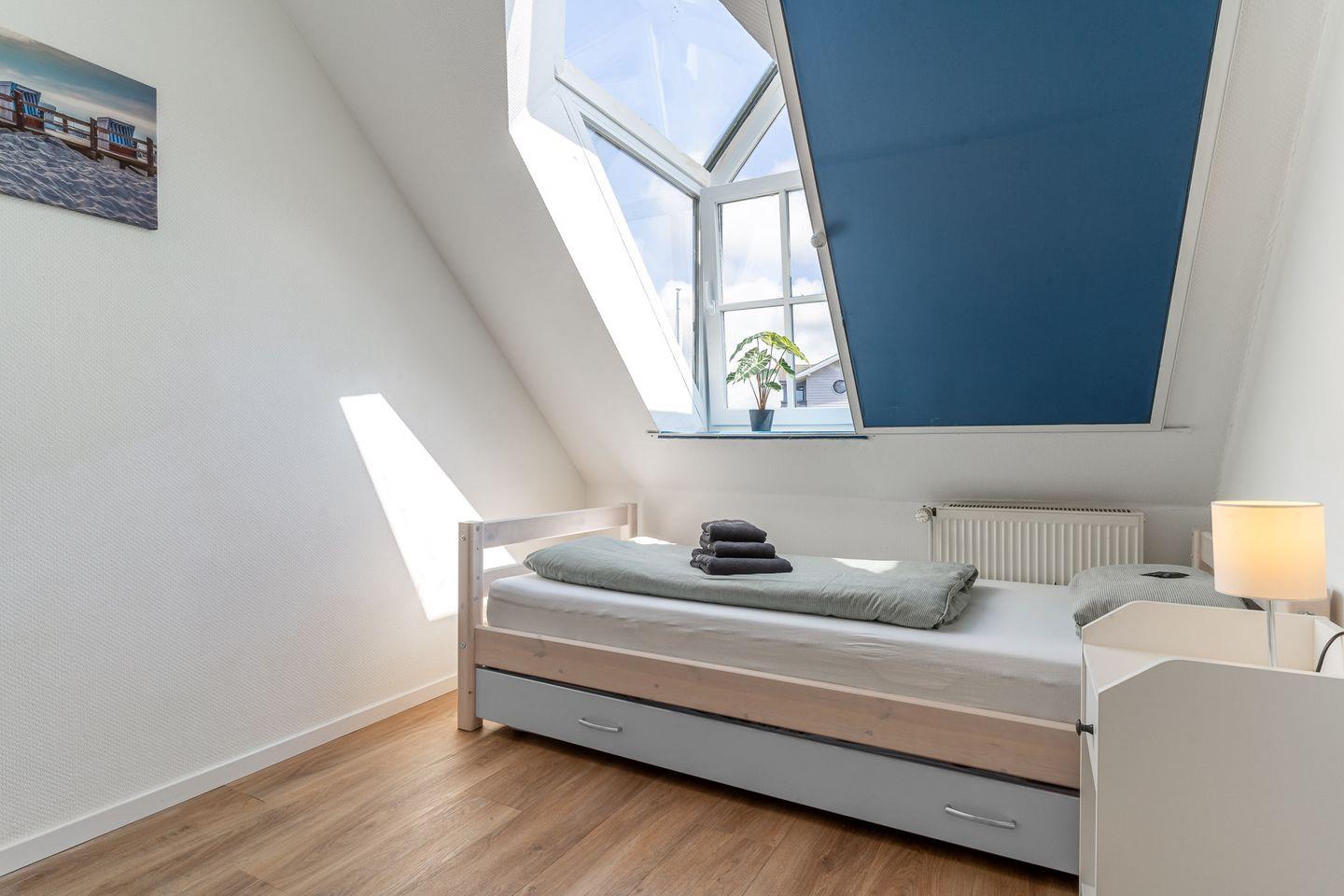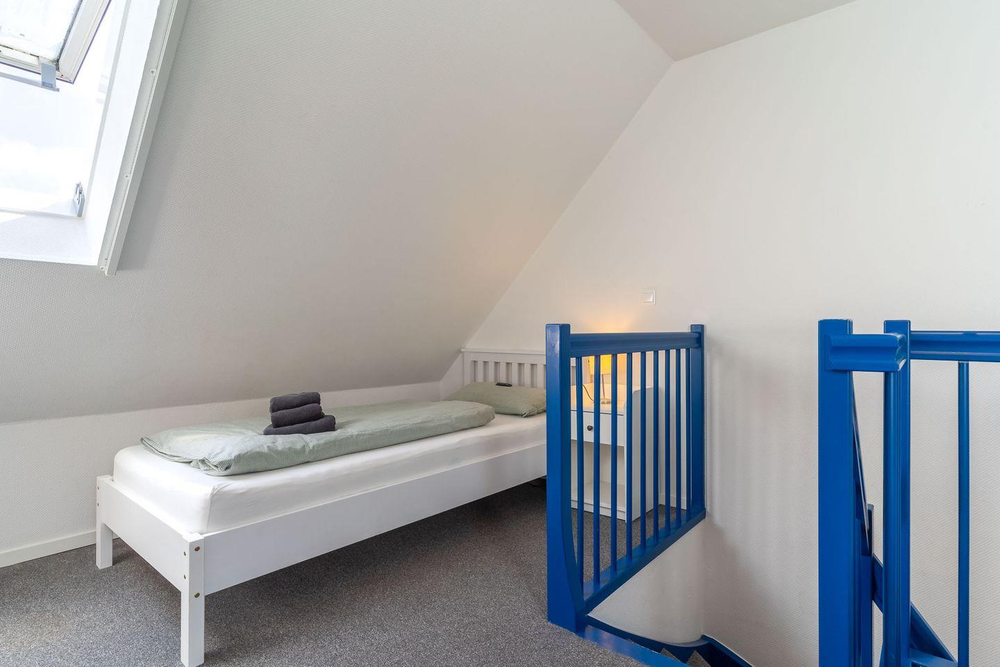 Eine Treppe im Wohnzimmer führt Sie zur offenen Schlafempore. Hier erwarten Sie ein komfortables Doppelbett und ein zusätzliches Einzelbett, die für einen erholsamen Schlaf sorgen. Diese Aufteilung macht die Wohnung ideal für Familien oder Gruppen, die gemeinsam die Schönheit der Nordsee erleben möchten.