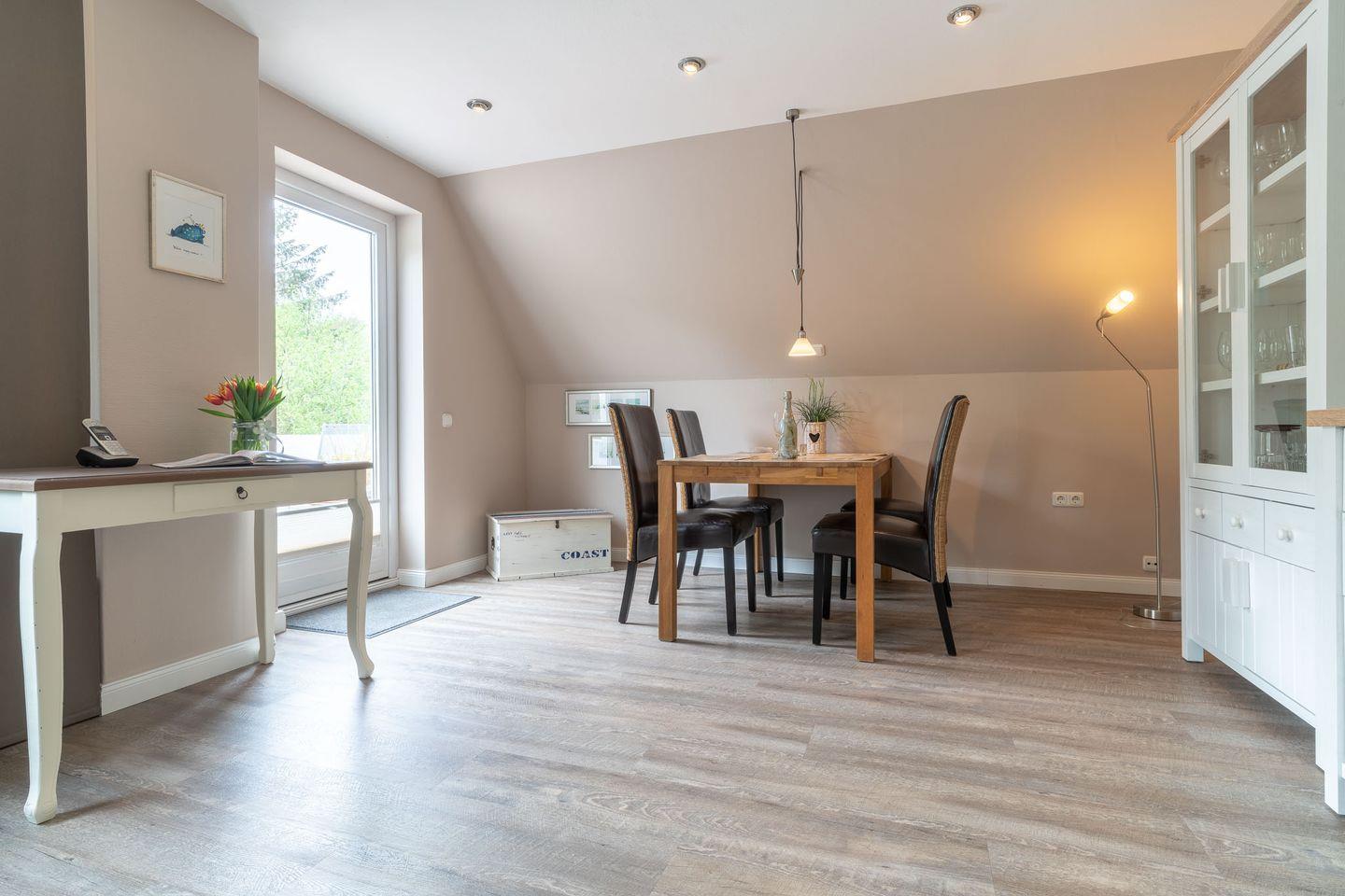 Die Ferienwohnung wird über einen separaten Eingang erreicht. Sie verfügt über insgesamt ca. 110 qm Wohnfläche. Im 1. Obergeschoss erreichen Sie von einem großzügigen Flur folgende Räume : kombinierter Wohn-Essbereich: gemütliche Couchgarnitur, Esstisch für 5 Pers., TV, Stereoanlage, von hier der Zugang zur 45 qm großen, nicht einsehbaren Dachterrasse in Süd-West-Lage, eine modern ausgestattete Küche mit Tisch und Sitzgelegenheit für 2 Pers., Geschirrspüler, zwei separate Schlafzimmer mit jeweils einem 1,80 breitem Doppelbett, Kleiderschrank und Nachtkonsolen, einen Abstellraum mit Waschmaschine, und das Badezimmer mit Duschbad und Fußbodenheizung. Über eine Edelstahltreppe gelangen Sie vom Schlafzimmer 1 in den offenen, lichtdurchfluteten Dachbodenbereich. Hier befindet sich als Ausweich- und Kuschelbereich ein weiteres Doppelbett sowie ein Einbauschrank. Die Dachfenster sind mit Verdunklung ausgestattet. Ein Flachbildfernseher sowie ein DVD-Player, lassen auch hier keine Wünsche übrig.