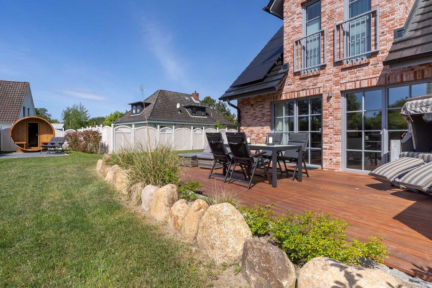 Ein Highlight ist die Außenanlage mit großzügiger Terrasse, Garten und bequemen Gartenmöbeln, die zum Verweilen einladen. Entspannen Sie in der Außensauna oder unternehmen Sie einen kurzen Spaziergang zum nahegelegenen Golfplatz.