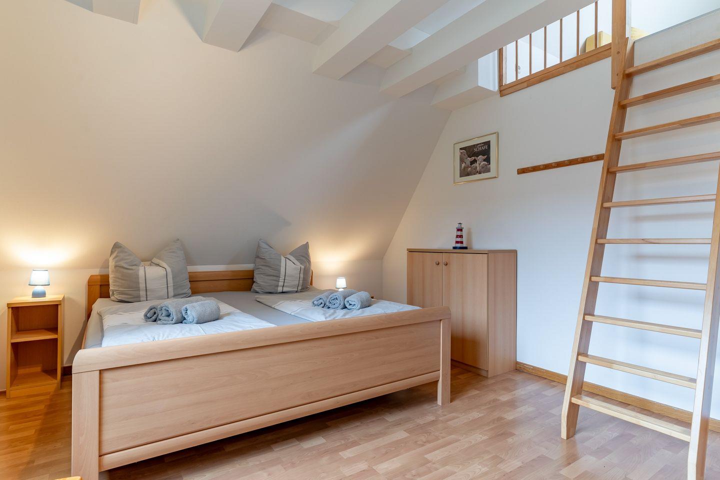 Das Oberschoß ist in zwei Bereiche eingeteilt, jeweils mit einem Master-Schlafzimmer mit einem 180x200cm Doppelbett und Kleiderschrank und je einem weiteren Schlafzimmer, eines mit einem 140x200cm Doppelbett und eines mit zwei Einzelbetten.