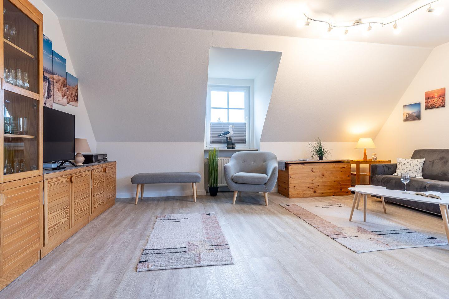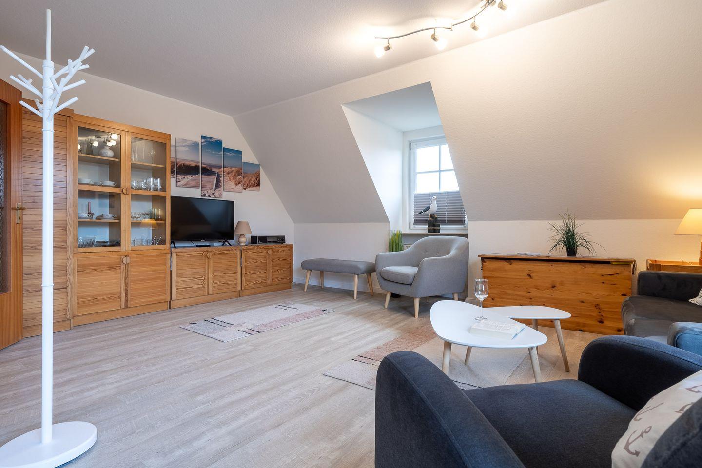 Diese moderne Ferienwohnung im Ortsteil Dorf von St. Peter-Ording bietet auf 48 Quadratmetern Platz für bis zu 4 Personen. Sie verfügt über ein großzügiges Wohnzimmer mit Schlafcouch, eine offene Küche und ein Schlafzimmer im Dachgeschoss mit zwei Einzelbetten. Der sonnige Balkon lädt zum Entspannen ein. Die zentrale Lage ermöglicht es, Strand, Restaurants und Geschäfte bequem zu Fuß zu erreichen – perfekt für einen erholsamen Nordsee-Urlaub!