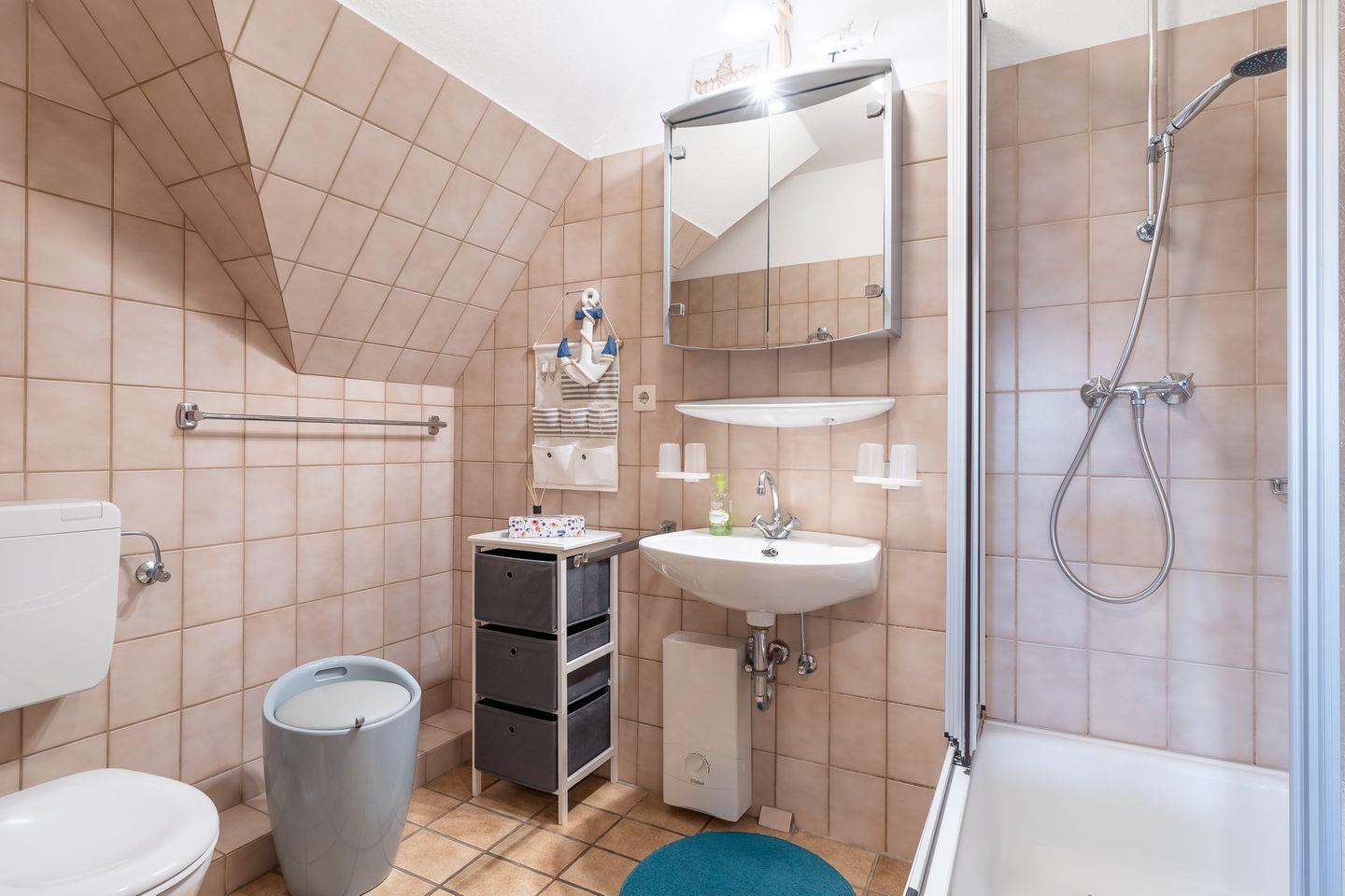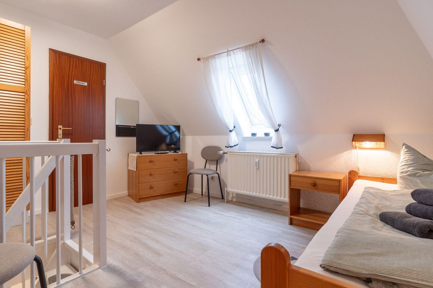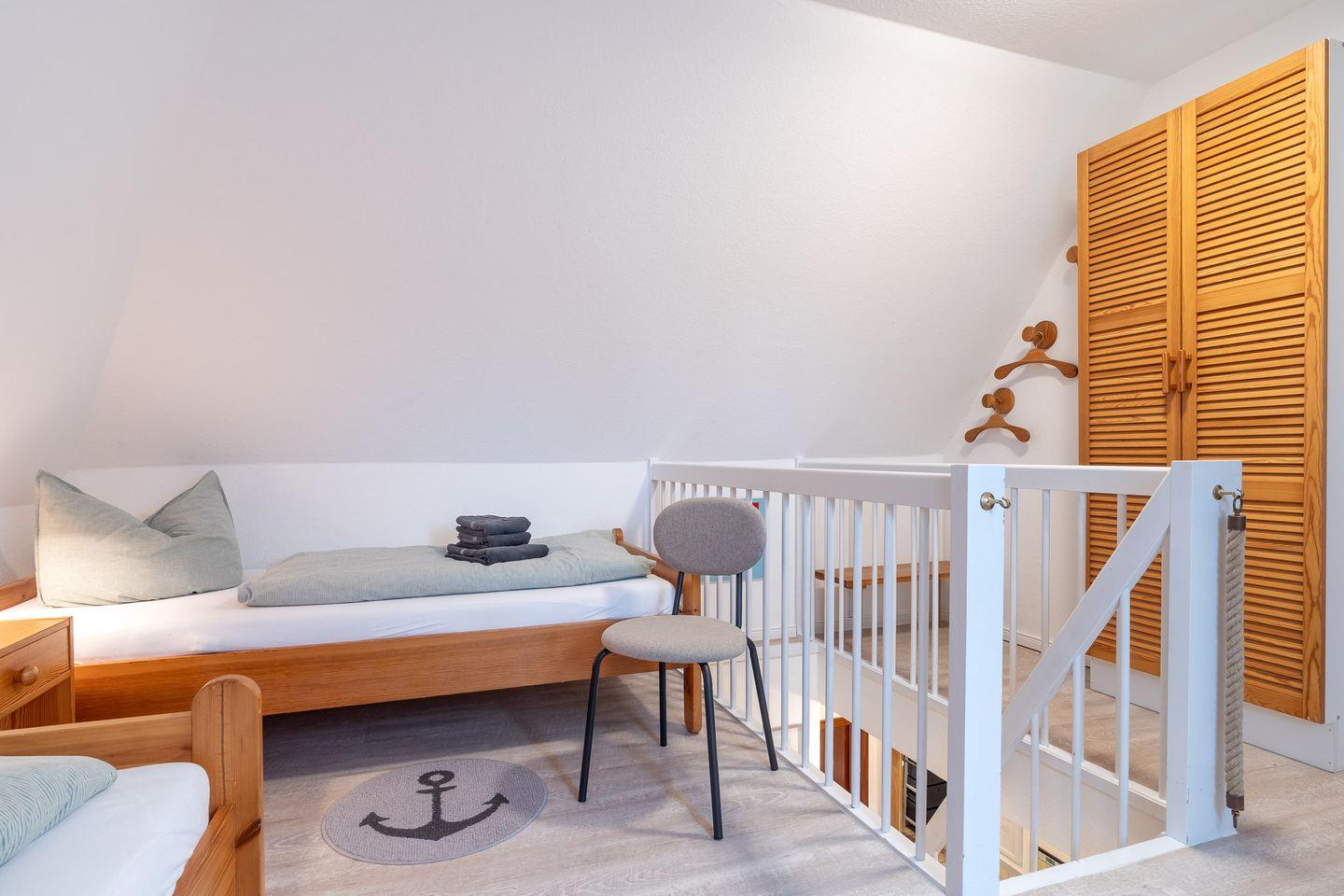 Das Schlafzimmer im Dachgeschoss erreichen Sie über eine relativ steile Treppe. Hier erwarten Sie zwei gemütliche Einzelbetten, die für erholsamen Schlaf sorgen. Diese Raumaufteilung macht die Wohnung ideal für Familien oder kleine Gruppen von Freunden, die ihren Urlaub an der Nordsee genießen möchten.