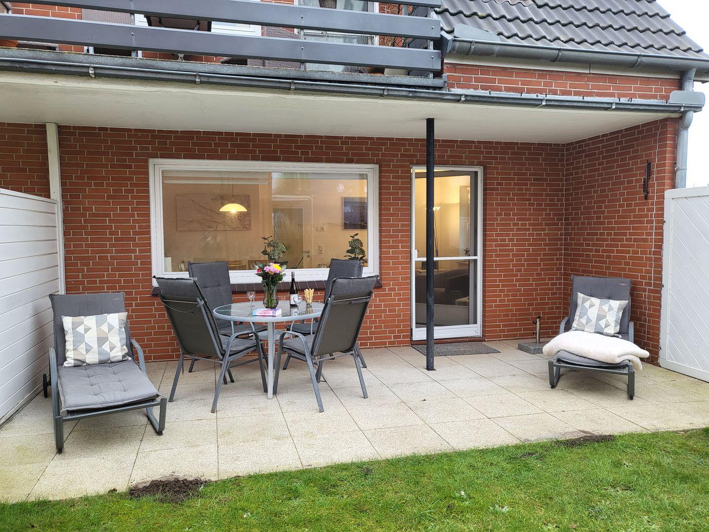 Auf der geräumigen Terrasse haben Sie Platz für Sonnenliegen und Tisch mit Stühlen. Eine Aussensteckdose ist vorhanden, falls Sie einen Elektrogrill nutzen möchten.