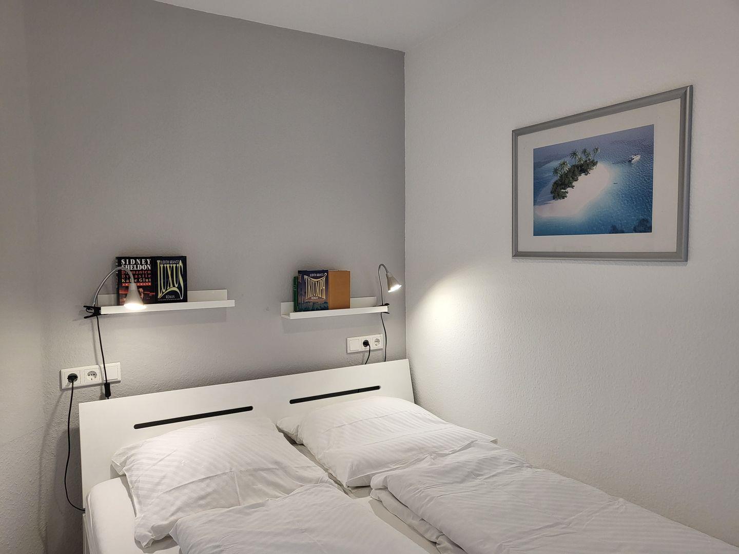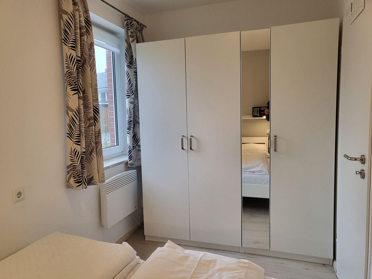 Ein separates Schlafzimmer mit einem Doppelbett 160x 200 cm und Kleiderschrank.