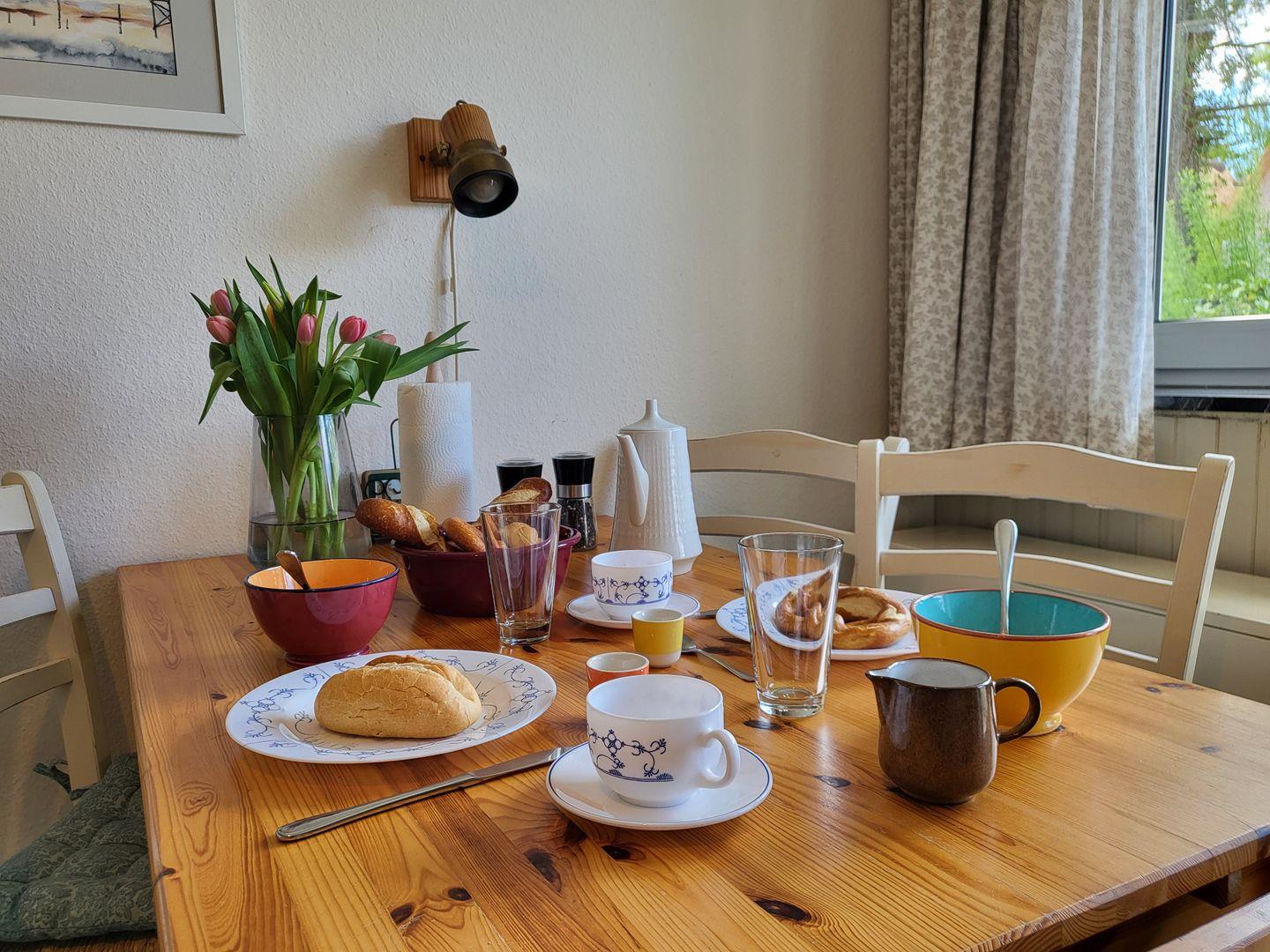 Die Kochnische ist vollständig ausgestattet und bietet alles, was Sie für die Zubereitung Ihrer Mahlzeiten benötigen, inklusive Kühlschrank mit Gefrierfach, 2-Platten-Herd, Wasserkocher, Toaster und Kaffeemaschine. Genießen Sie Ihre selbstgekochten Leckerbissen am Esstisch oder im Freien auf der überdachten Terrasse, wo Sie die frische Nordseebrise genießen können.