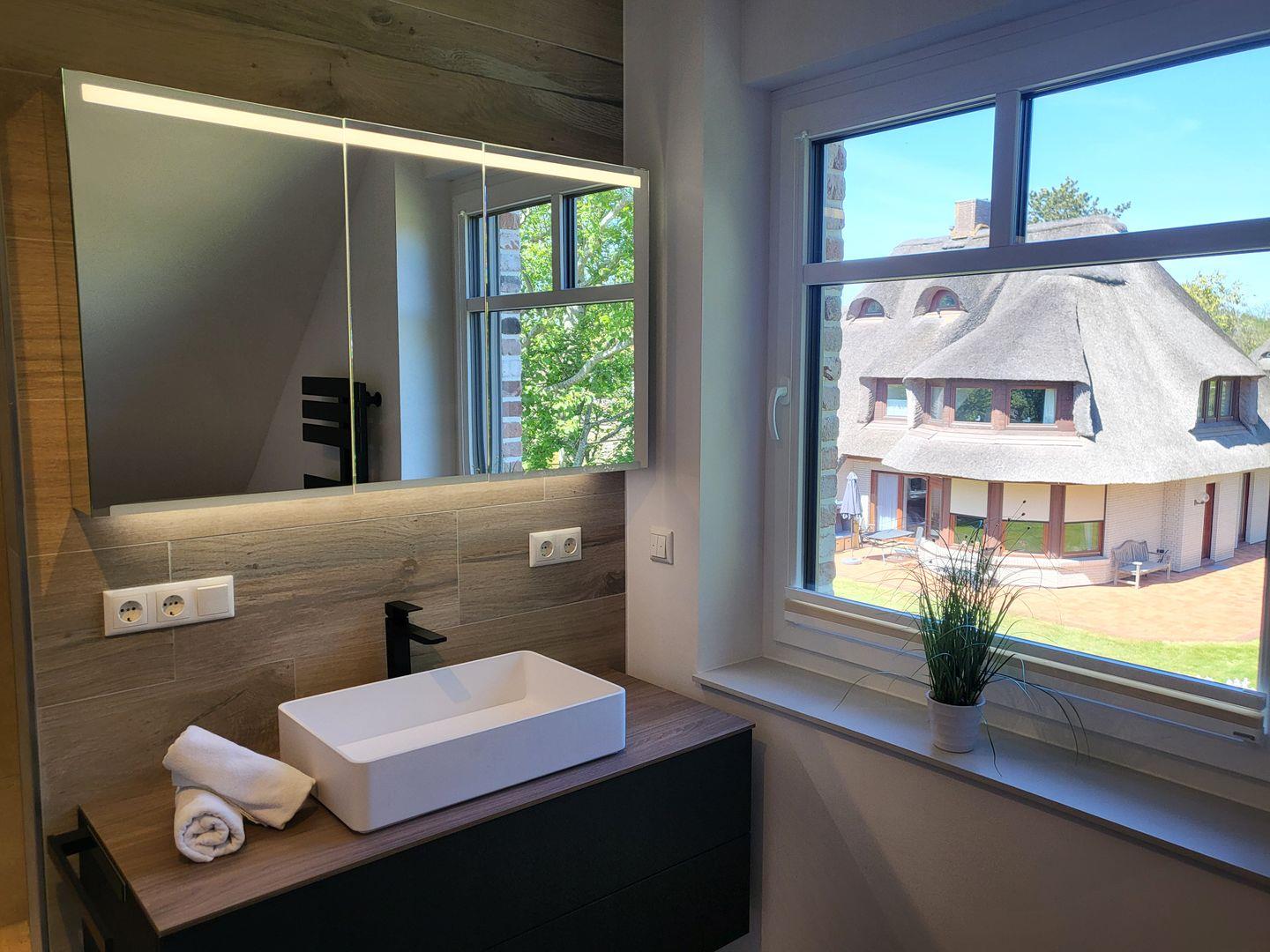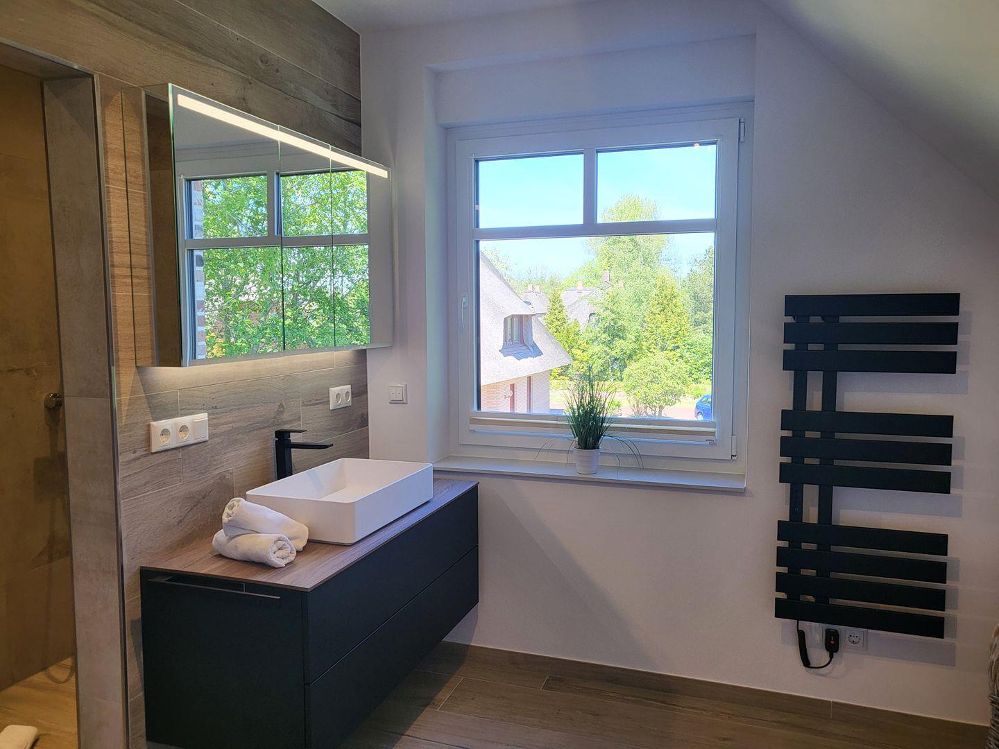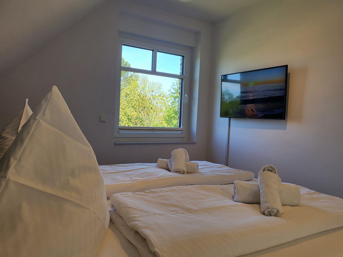Die beiden stilvollen Schlafzimmer im Obergeschoß sind mit modernen Möbeln, Boxspringbetten (180 x 200) und Parkettboden ausgestattet, und bieten einen angenehmen Rückzugsort nach einem aktiven Tag am Strand. Die beiden Badezimmer verfügen über bodengleiche Duschen, Waschbecken, WC und komfortable Spiegel, während ein Haartrockner für Ihren Komfort bereitsteht. Kostenloses WLAN und zwei Smart-TV´s sorgen dafür, dass Sie auch bei schlechtem Wetter gut unterhalten werden.