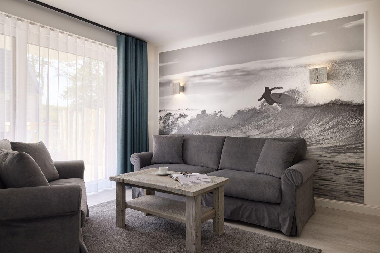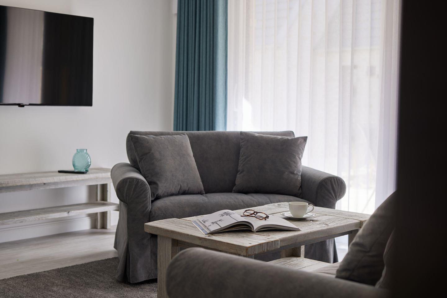 Das moderne Apartment ist im lässigen Beachstyle gestaltet und schafft mit ca. 70 m² ein großzügiges Wohngefühl. Der Wohn- und Essbereich mit exklusiver, integrierter Küche und Design-Polstermöbeln lädt zum entspannten Zusammensein ein und grenzt direkt an Ihre private Sonnenterrasse. Das Schlafzimmer mit bequemem Boxspringbett bietet Platz für zwei Gäste. Das geschmackvolle Badezimmer verfügt über eine ebenerdige Dusche.