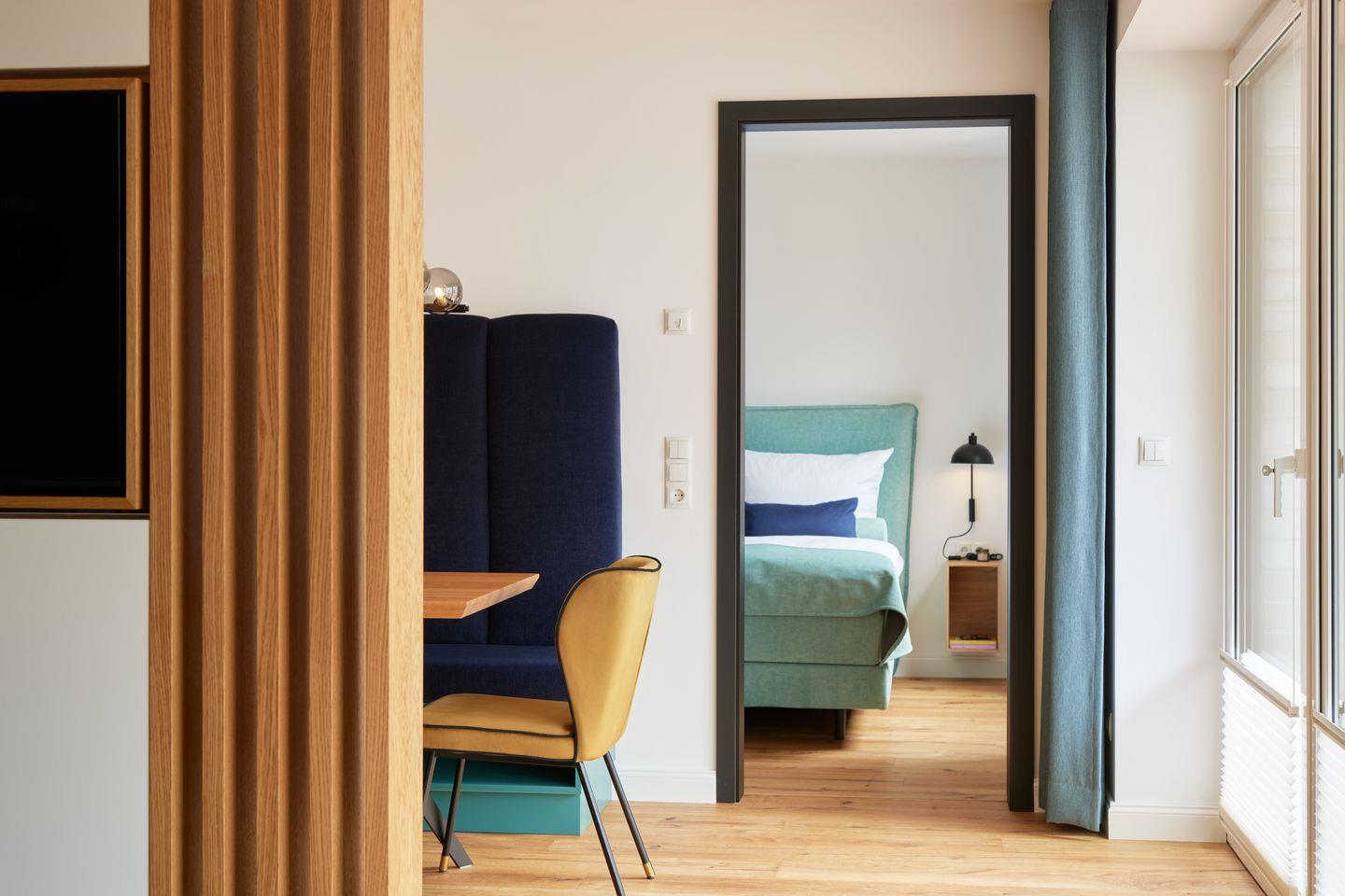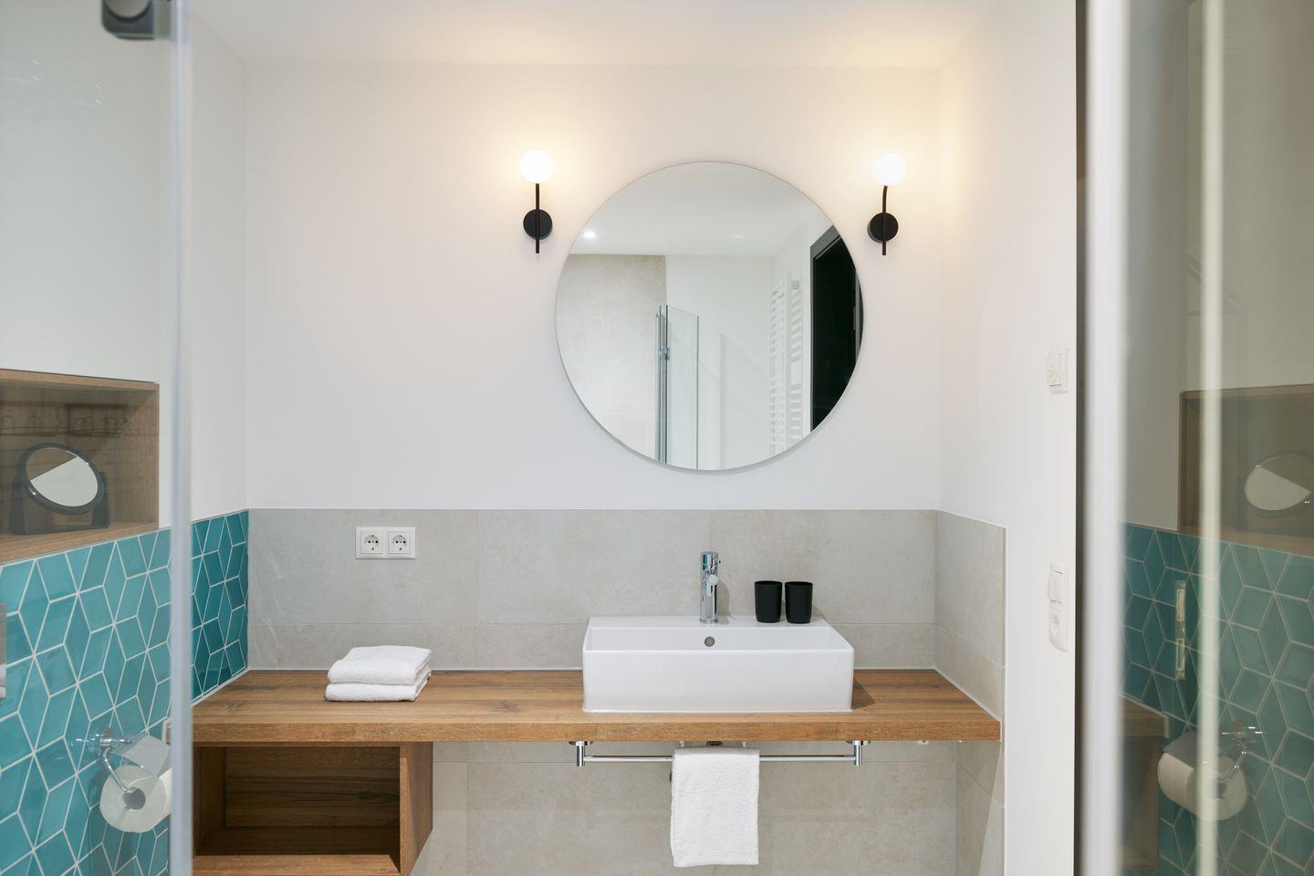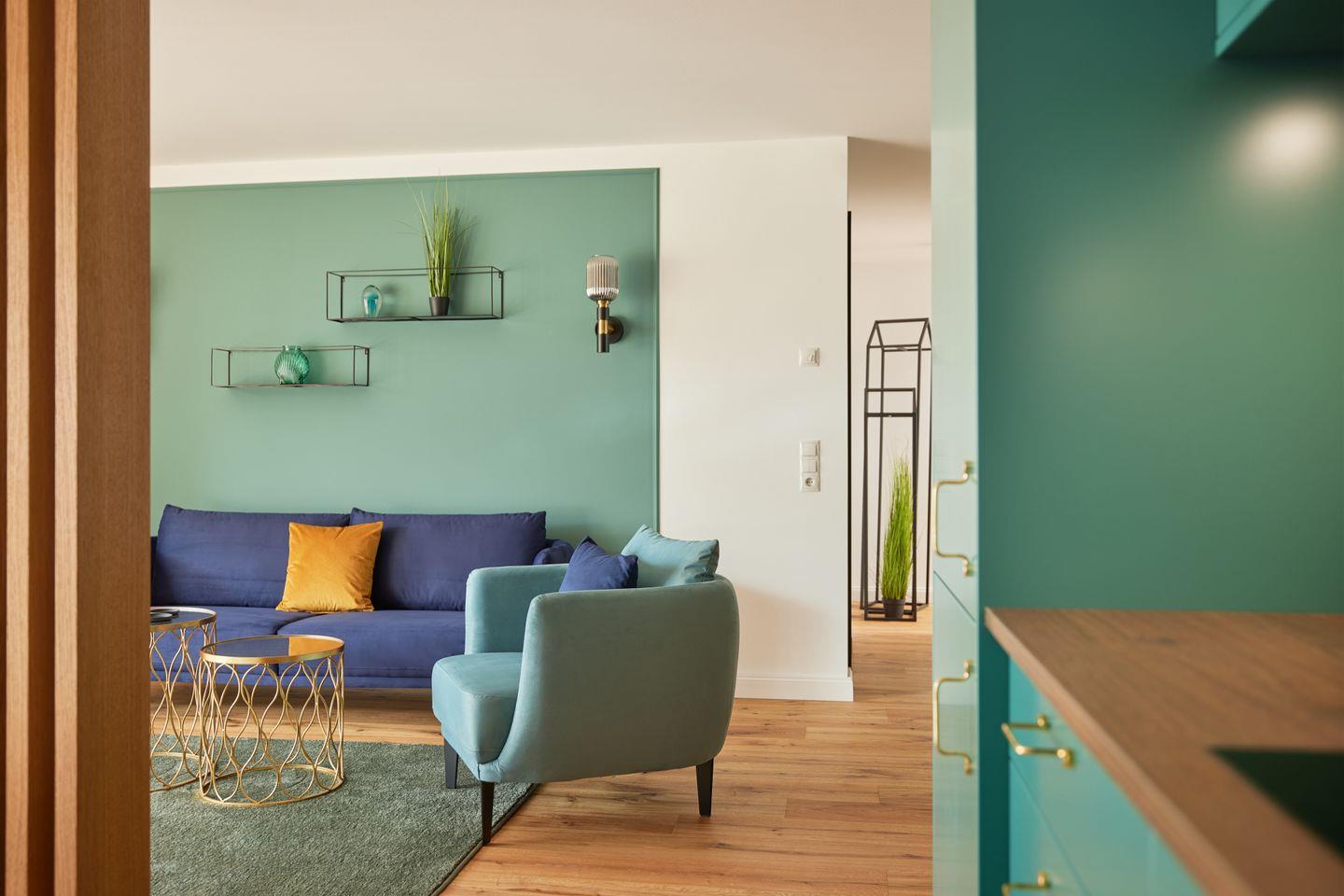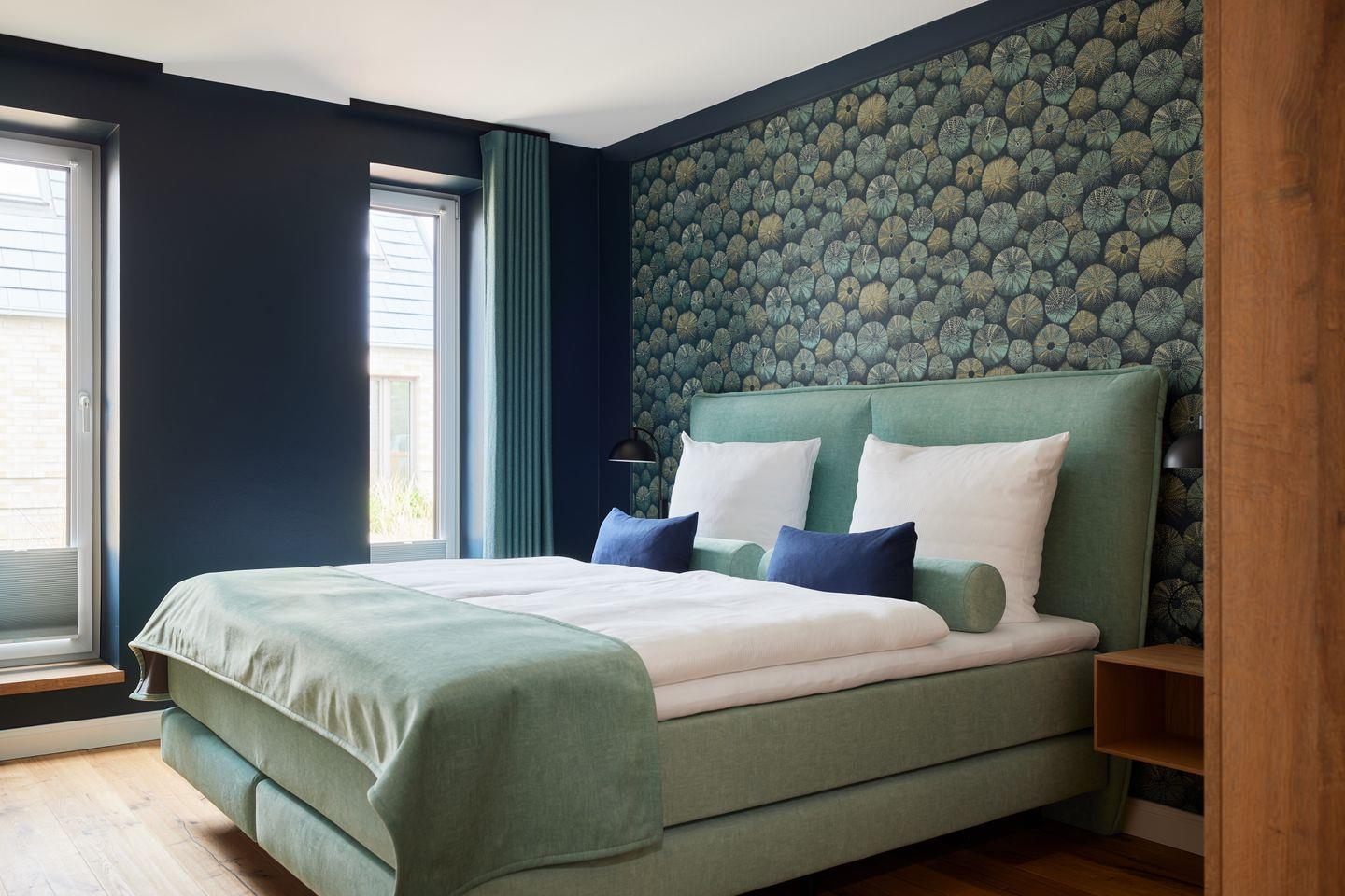Der durchdachte Grundriss des ca. 95 m² großen Apartments schafft ein großzügiges Wohngefühl. Der Wohn- und Essbereich mit integrierter Küche und Design-Polstermöbeln lädt zum entspannten Zusammensein ein und grenzt direkt an Ihre private Sonnenterrasse. Ein Highlight ist die hochwertige Küche mit türkisfarbenen Fronten und goldenen Armaturen – stilvoll und maritim. Zwei Schlafzimmer mit bequemen Boxspringbetten bieten Platz für vier Gäste. Besonders komfortabel: zwei moderne Badezimmer mit begehbarer Dusche, eines davon sogar en suite.