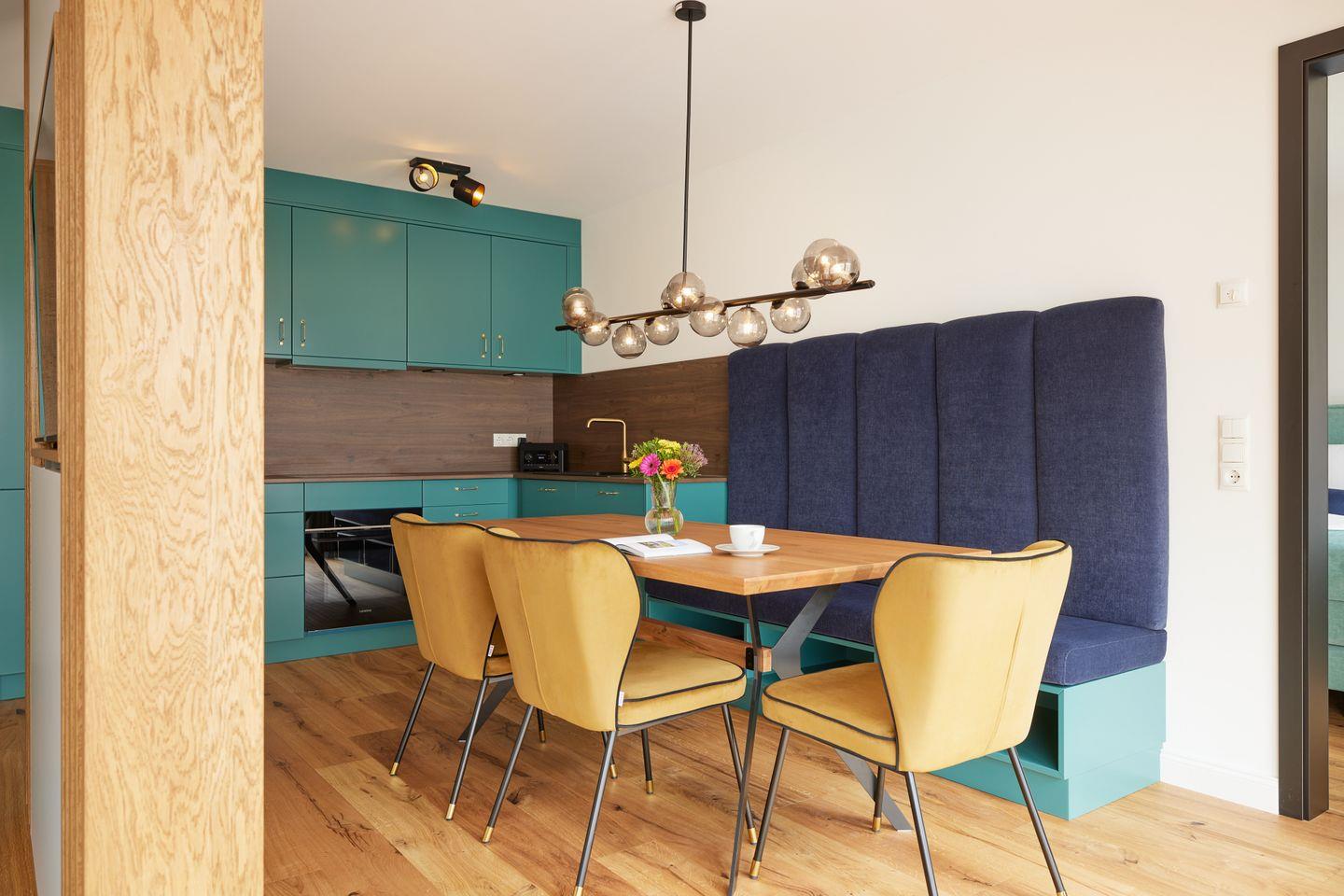 Der Wohn- und Essbereich mit integrierter Küche und Design-Polstermöbeln lädt zum entspannten Zusammensein ein und grenzt direkt an Ihre private Sonnenterrasse.
