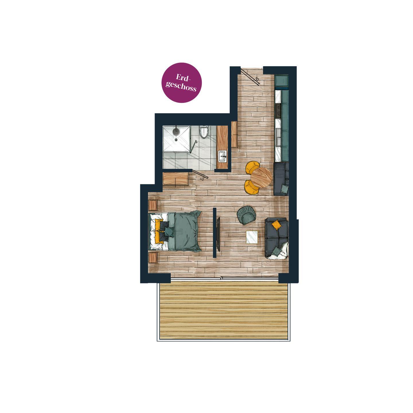 Die durchdachte Ausstattung des ca. 53 m² großen 1-Zimmer-Apartments schafft ein einzigartiges Wohngefühl und bietet Platz für bis zu zwei Gäste.
