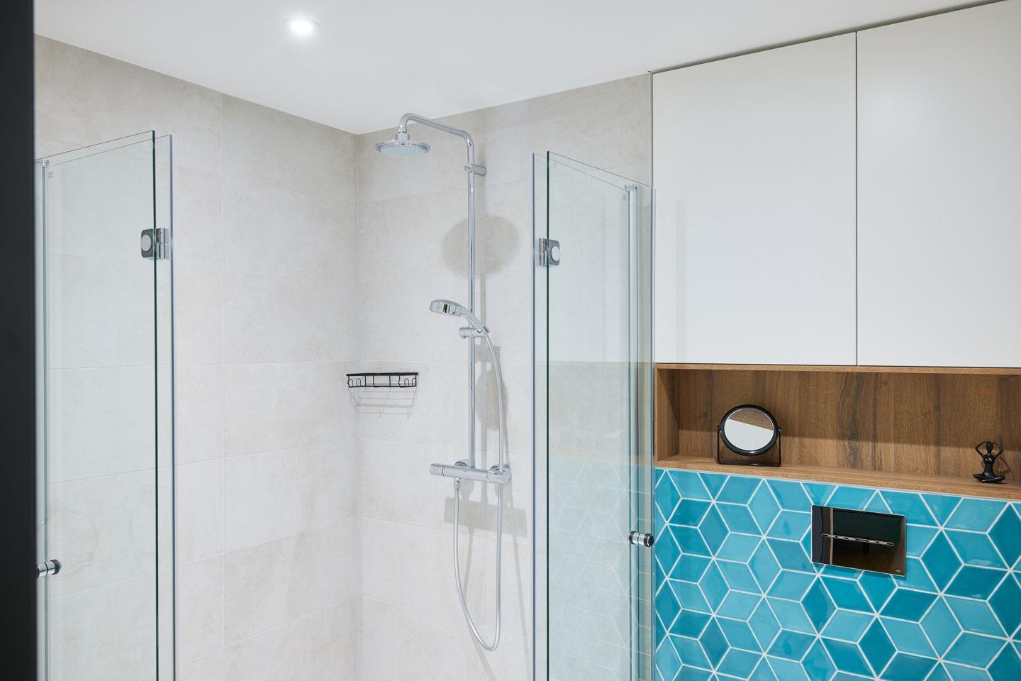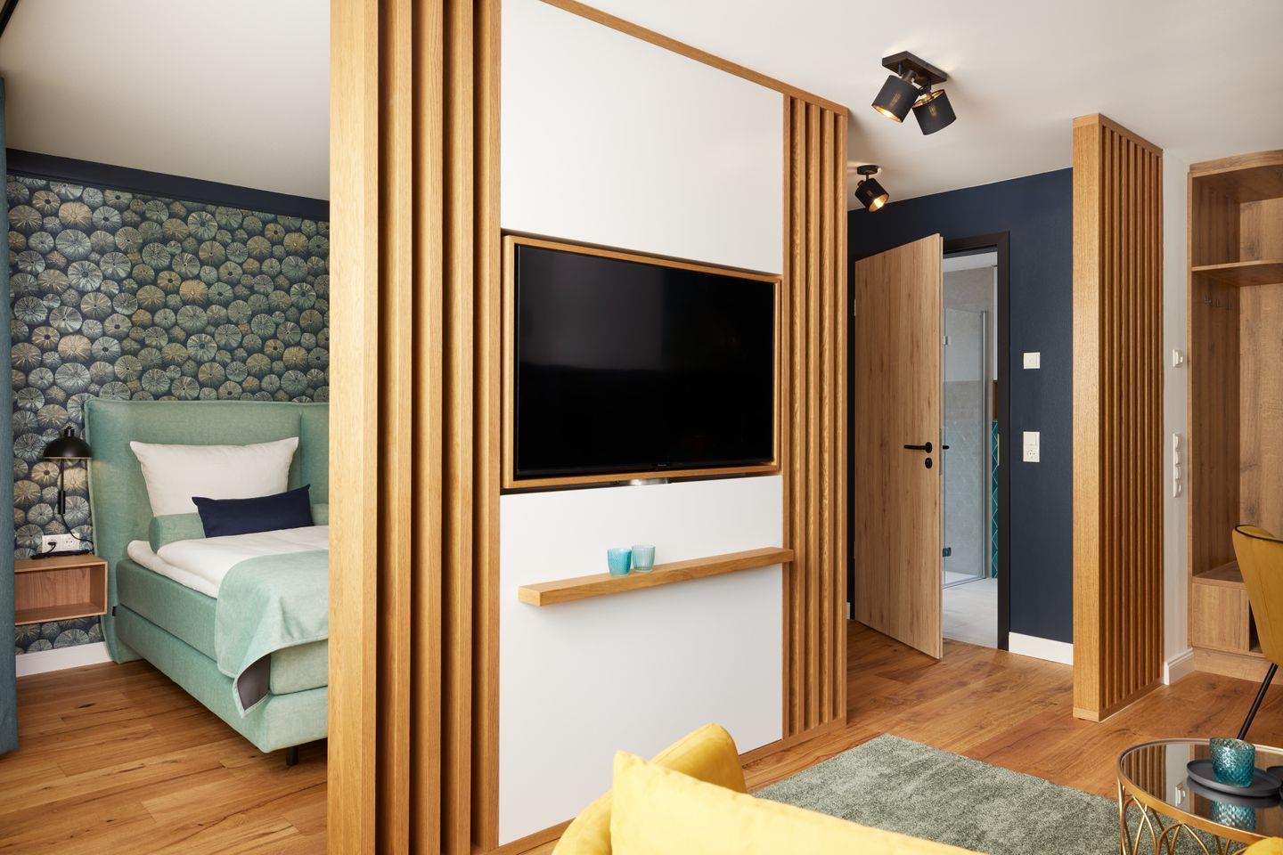 Der Schlafbereich des offen gestalteten Apartments ist durch eine Trennwand geschickt vom Wohnbereich separiert. Hier genießen Sie ein hochwertiges Boxspring-Doppelbett und können sich wunderbar entspannen. Auch ein modernes Badezimmer mit ebenerdiger Dusche gehört zur elegant-maritimen Ausstattung.