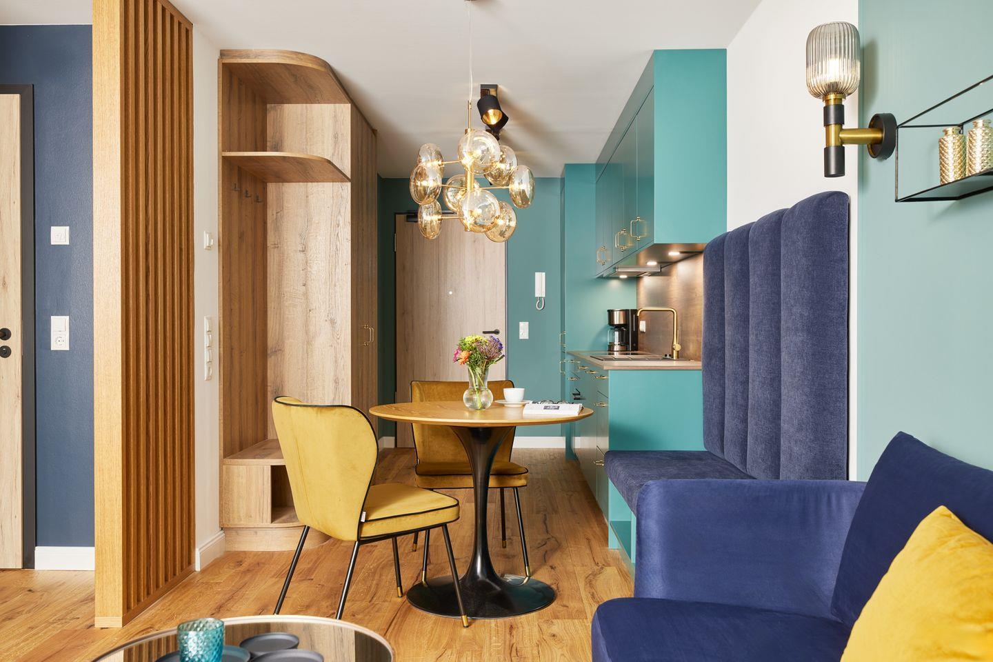 Die durchdachte Ausstattung des ca. 53 m² großen 1-Zimmer-Apartments schafft ein einzigartiges Wohngefühl und bietet Platz für bis zu zwei Gäste. Der Wohn- und Essbereich mit integrierter Küche und Design-Polstermöbeln lädt zum gemütlichen Zusammensein ein und grenzt direkt an Ihre private Sonnenterrasse. Ein Highlight ist die hochwertige Küche mit tiefblauen Fronten und goldenen Armaturen.
