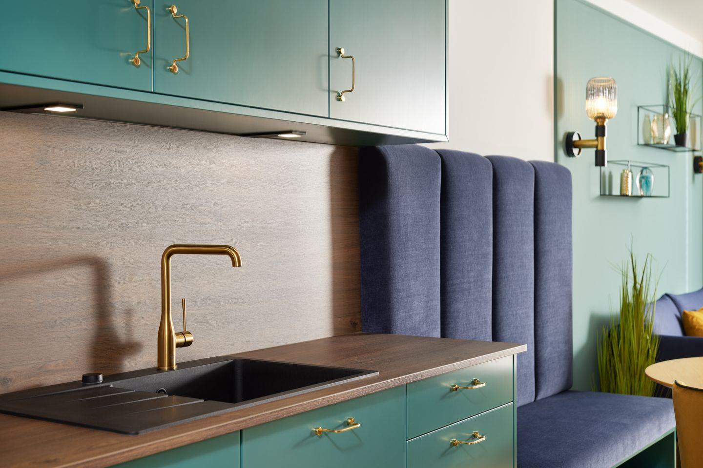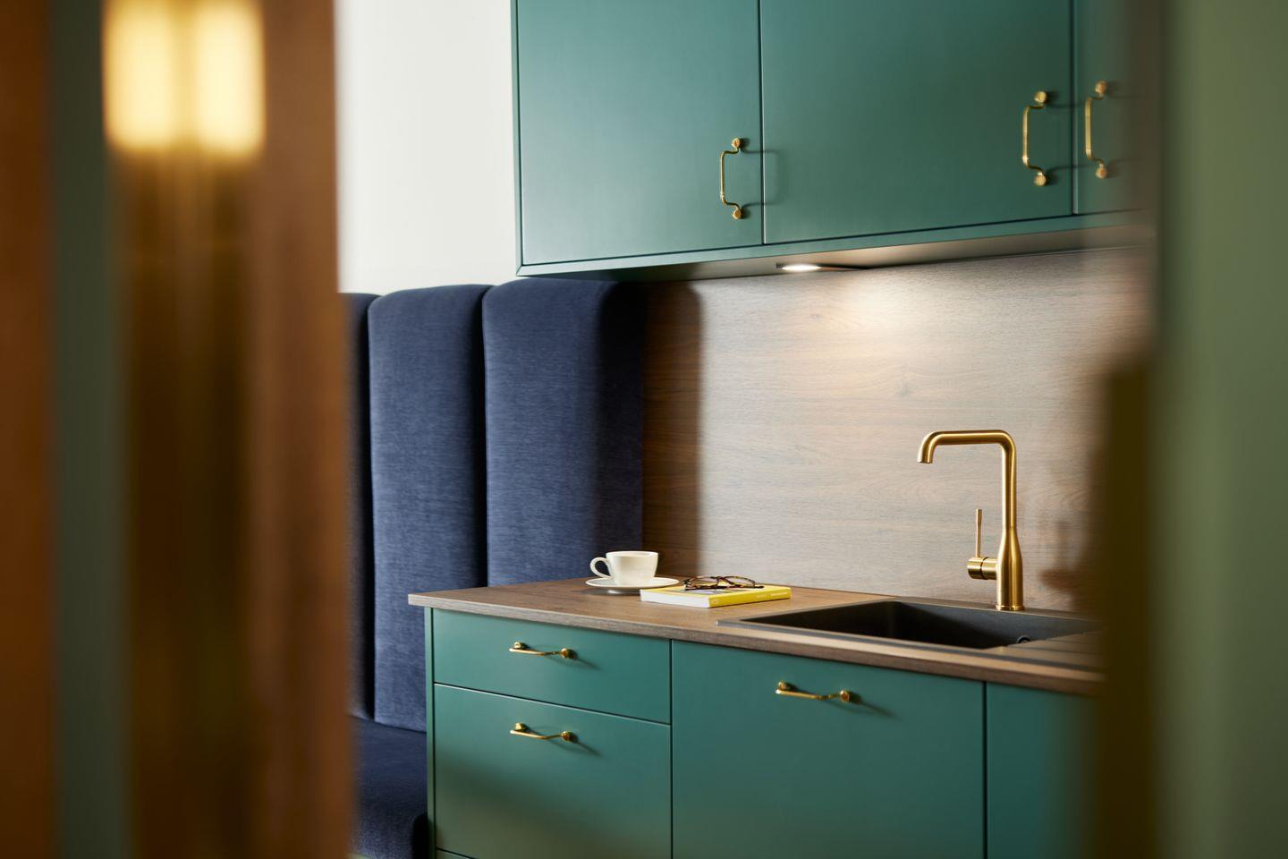 Ein Highlight ist die hochwertige Küche mit tiefblauen Fronten und goldenen Armaturen.