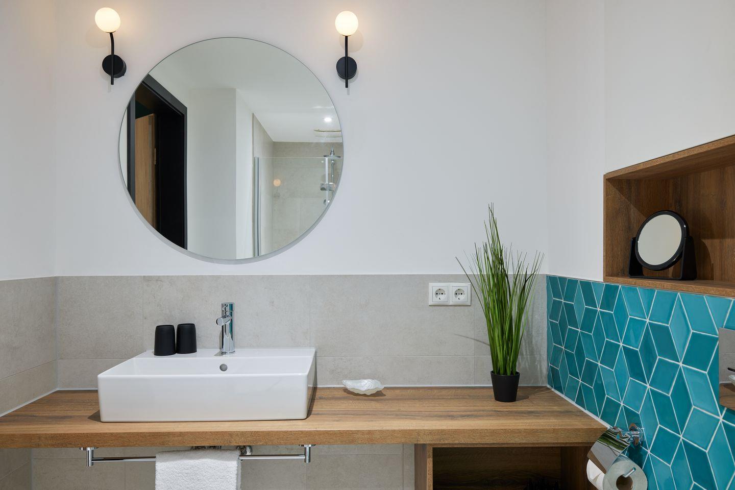 Der Schlafbereich des offen gestalteten Apartments ist durch eine Trennwand geschickt vom Wohnbereich separiert. Hier genießen Sie ein hochwertiges Boxspring-Doppelbett und können sich wunderbar entspannen. Auch ein modernes Badezimmer mit ebenerdiger Dusche gehört zur elegant-maritimen Ausstattung.