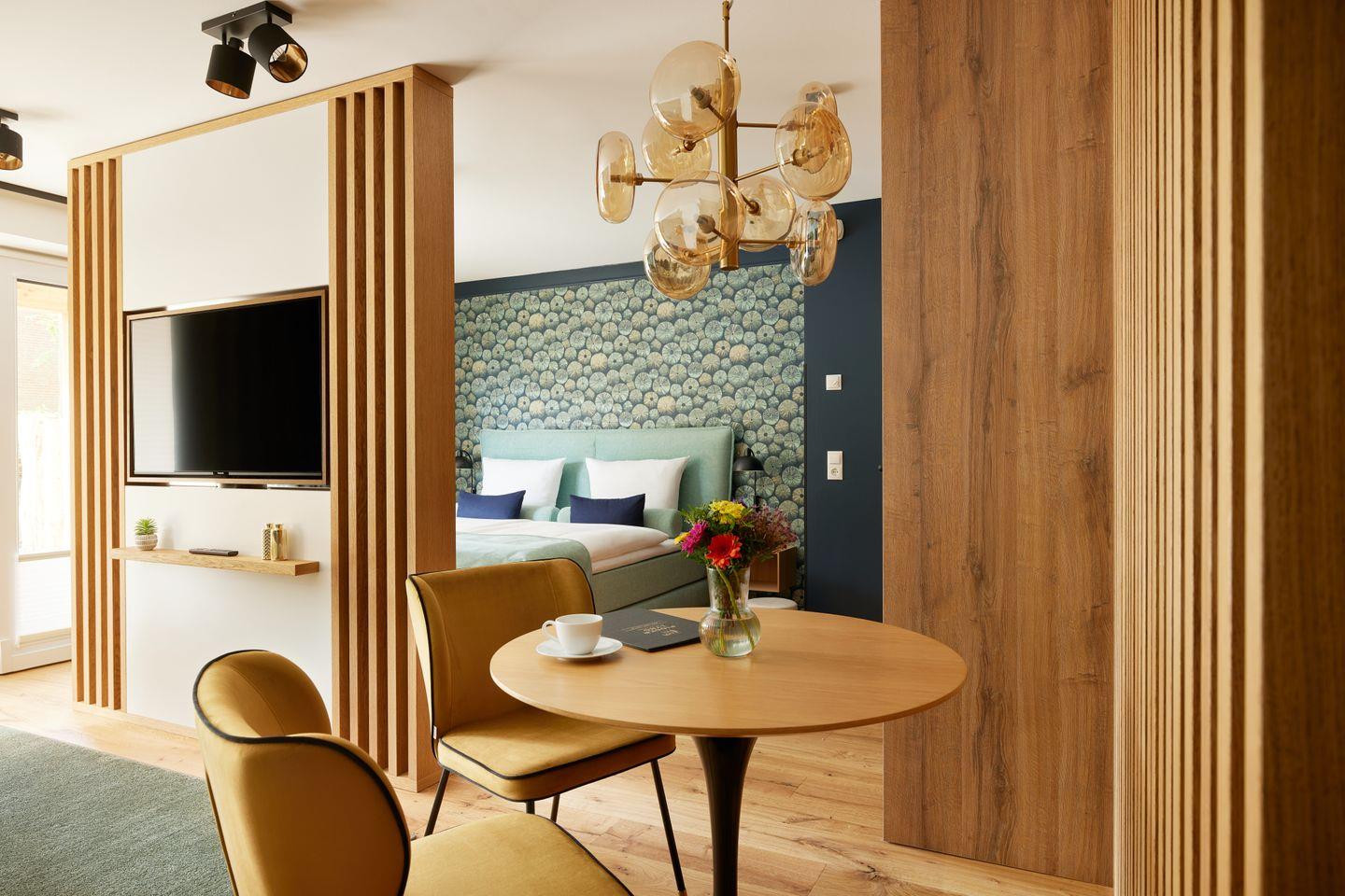 Die durchdachte Ausstattung des ca. 55 m² großen 1-Zimmer-Apartments schafft ein einzigartiges Wohngefühl und bietet Platz für bis zu zwei Gäste. Der Wohn- und Essbereich mit integrierter Küche und Design-Polstermöbeln lädt zum gemütlichen Zusammensein ein und grenzt direkt an Ihre private Sonnenterrasse. Ein Highlight ist die hochwertige Küche mit türkisenen Fronten und goldenen Armaturen.