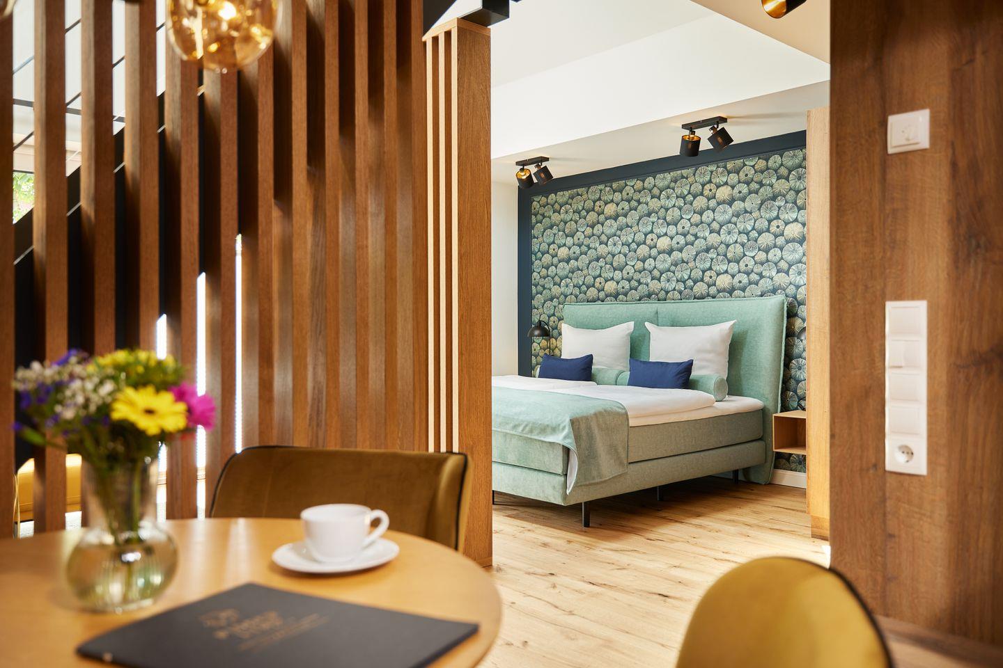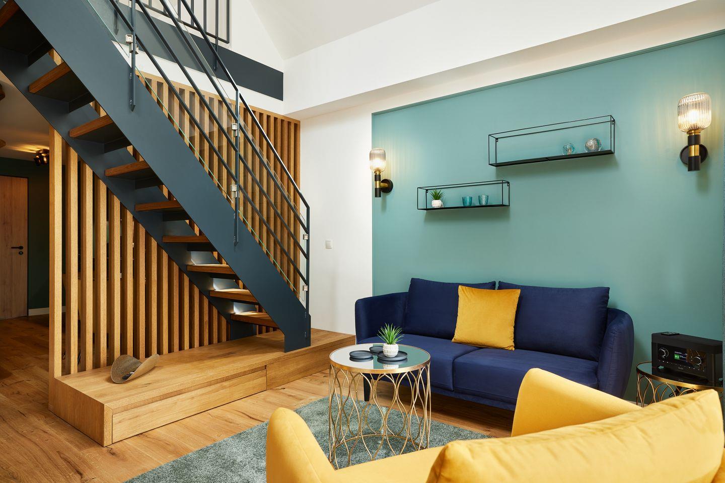 Die offene Konzeption des ca. 73 m² großen 1-Zimmer-Apartments schafft ein einzigartiges Wohngefühl und bietet Platz für bis zu zwei Gäste. Der Wohn- und Essbereich mit integrierter Küche und Design-Polstermöbeln lädt zum gemütlichen Zusammensein ein und grenzt direkt an Ihren privaten Sonnenbalkon. Nicht nur die hochwertige Küche mit türkisfarbenen Fronten und goldenen Armaturen ist ein Highlight: Über dem Wohnraum befindet sich eine große Galerie, die zum Entspannen einlädt.
