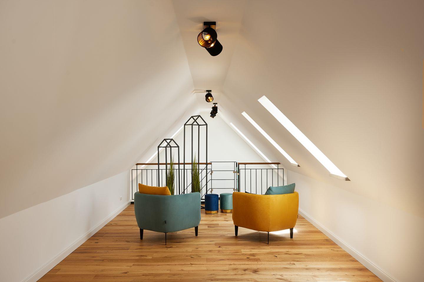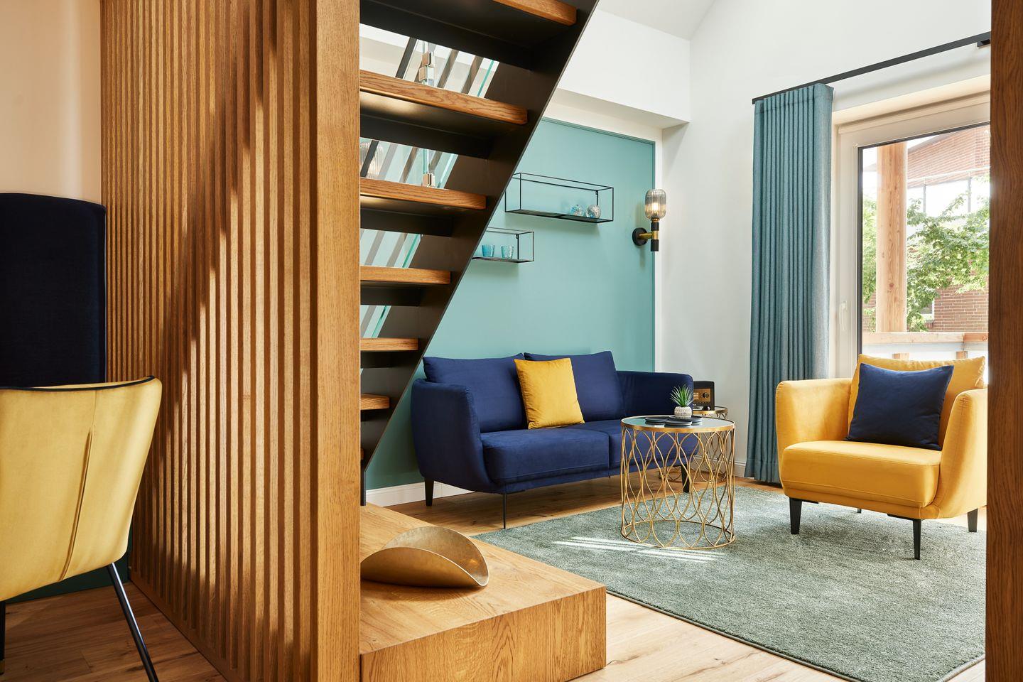 Nicht nur die hochwertige Küche mit tiefblauen Fronten und goldenen Armaturen ist ein Highlight: Über dem Wohnraum befindet sich eine große Galerie, die zum Entspannen einlädt.