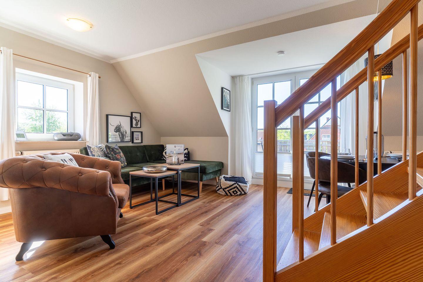 Die Ferienwohnung Möwe im 1. Obergeschoss (mit Staffelgeschoss) bietet auf 68 m² Platz für bis zu 4 Personen. Der gemütliche Wohnbereich mit Eckcouch, Sessel, Flachbild-TV, Radio und WLAN geht in einen Essplatz für 4 Personen über.