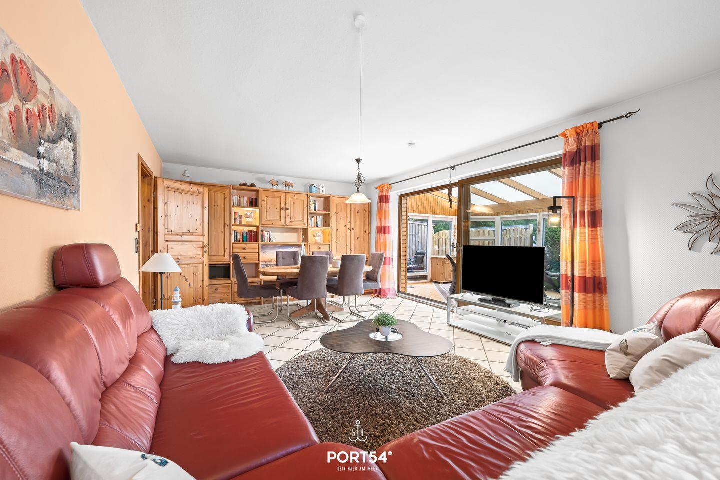 Die großzügige Wohnlandschaft lädt zum Entspannen und Verweilen ein. Der große Esstisch ermöglicht gemeinsame Mahlzeiten oder Spieleabende. Zur Unterhaltung stehen Ihnen ein Fernseher mit DVD-Spieler sowie viele Bücher zur Verfügung. Kostenloses WLAN sorgt dafür, dass Sie auch digital bestens verbunden bleiben.