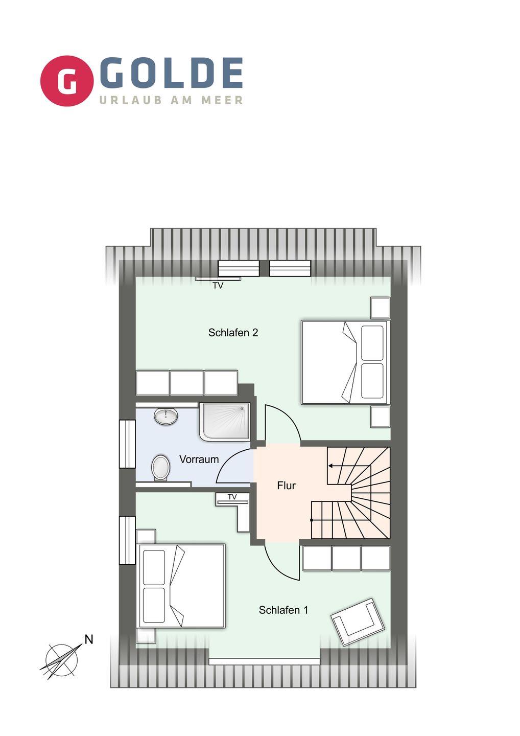 Zwei Schlafzimmer mit je einem Boxspring-Doppelbett (180x200 & 140x200 m) sind ausgestattet mit TV und großen Kleiderschränken. Darüber hinaus befindet sich im Obergeschoss ein weiteres Bad mit Dusche.
