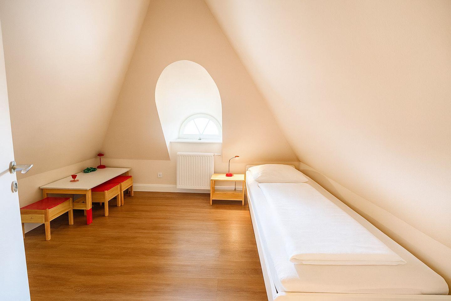 Das Dachgeschoss beherbergt ein weiteres Schlafzimmer mit einem Einzelbett, wo sich ein Kinderparadies mit Spielsachen und Kindermöbeln befindet.
